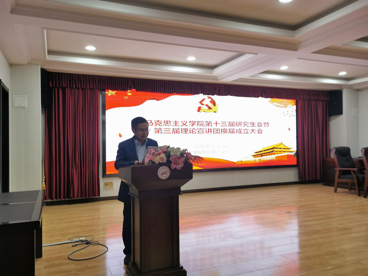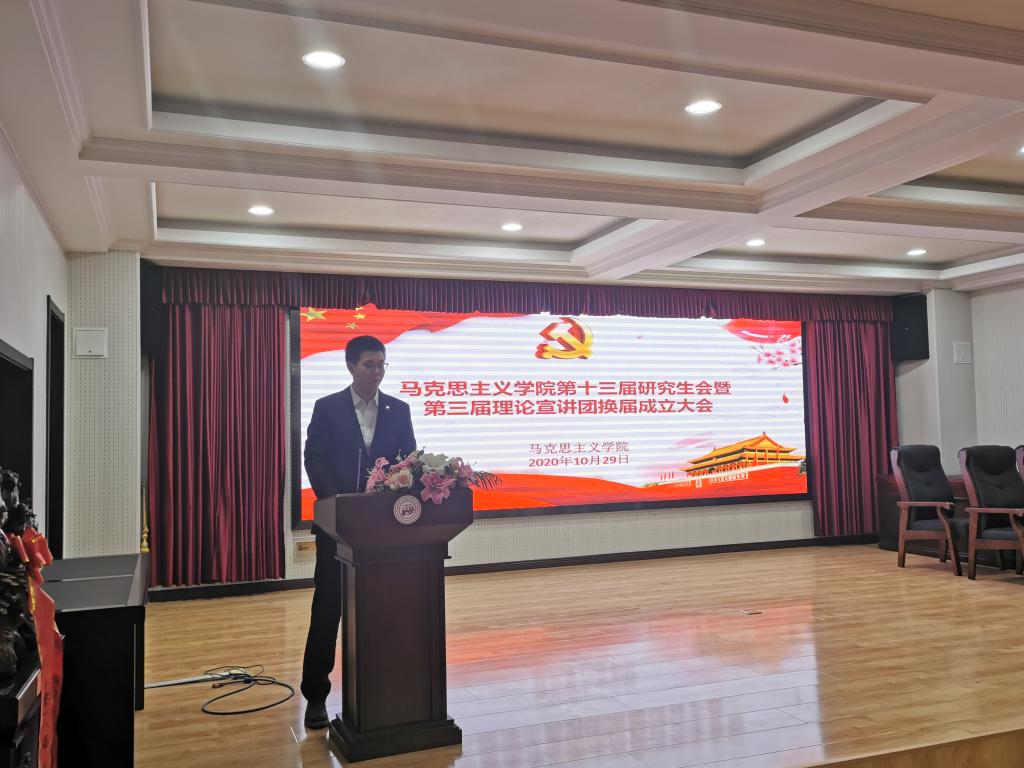 2020年10月29日下午,馬克思主義學(xué)院在報(bào)告廳舉行第十三屆研究生會(huì)暨第三屆理論宣講團(tuán)換屆成立大會(huì)。馬克思主義學(xué)院黨總支書記張鳴、院長(zhǎng)曹勝、副院長(zhǎng)張運(yùn)君,馬克思主義學(xué)院第十二屆研究生會(huì)主席團(tuán)成員、各部門部長(zhǎng),第十三屆研究生會(huì)全體成員以及習(xí)近平新時(shí)代中國(guó)特色社會(huì)主義思想宣講團(tuán)全體成員參加活動(dòng)。本次活動(dòng)由2020級(jí)韓新怡主持。