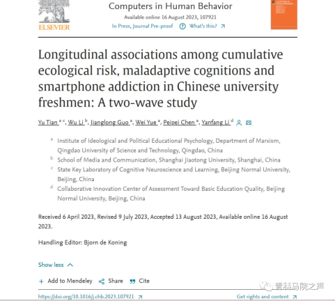 該論文揭示了大學(xué)生累積生態(tài)風(fēng)險與智能手機成癮的雙向關(guān)系及作用機制,這為大學(xué)生智能手機成癮的干預(yù)提供了重要科學(xué)依據(jù)。