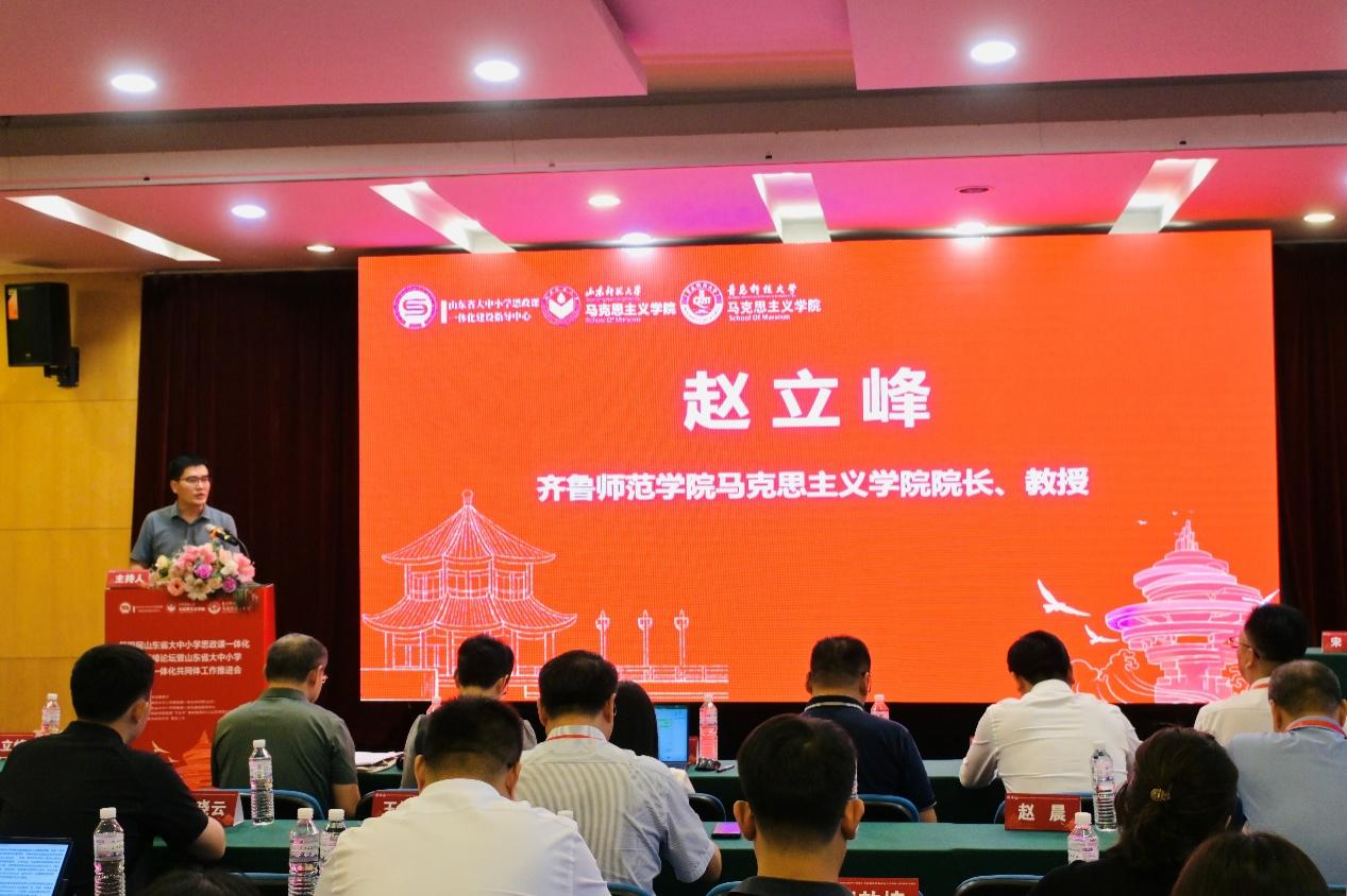 參會專家發(fā)言環(huán)節(jié)由齊魯師范學(xué)院馬克思主義學(xué)院院長趙立峰教授主持。日照市東港區(qū)委教育工委常務(wù)副書記、區(qū)教體局黨組書記、局長宋磊以《“思政+”:溝通“大思政課”一體化育人新格局》為題,濟南大學(xué)馬克思主義學(xué)院執(zhí)行院長楊立志教授以《大中小學(xué)思政課一體化建設(shè)的挑戰(zhàn)與策略》為題,青島市教科院教研員徐開顏以《義務(wù)教育階段思政課政治認同一體化教學(xué)改進的青島實踐》為題,山東農(nóng)業(yè)工程學(xué)院馬克思主義學(xué)院院長、黨總支書記周安忠以《發(fā)揮農(nóng)林高校辦學(xué)特色優(yōu)勢賦能區(qū)域大中小思政教育一體化建設(shè)》為題,山東警察學(xué)院馬克思主義學(xué)院副院長姚志峰教授以《以公安思政賦能大中小學(xué)思政一體化建設(shè)》為題,山東農(nóng)業(yè)大學(xué)馬克思主義學(xué)院副院長李國鋒教授以《紅綠交融助力大中小學(xué)思政課一體化建設(shè)》為題,青島科技大學(xué)馬克思主義學(xué)院教研室黨支部書記馬麗娟以《協(xié)同視域下推進大中小學(xué)思政課一體化建設(shè)》為題,圍繞高校及區(qū)域特色資源賦能大中小學(xué)思政課一體化建設(shè)等議題開展研討交流,全面闡釋了推動大中小思政課一體化建設(shè)的策略與路徑。