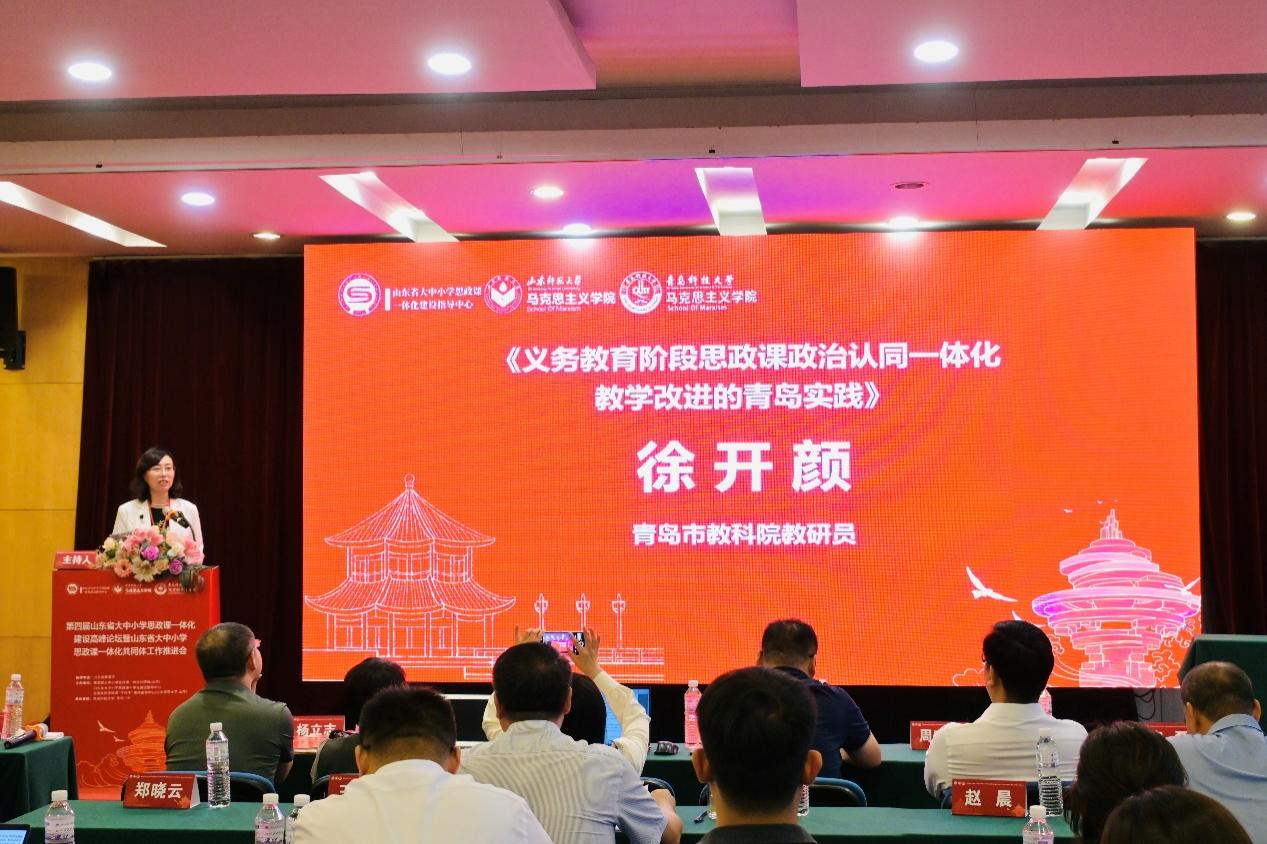 青島市教科院教研員徐開顏以《義務(wù)教育階段思政課政治認同一體化教學(xué)改進的青島實踐》為題發(fā)言