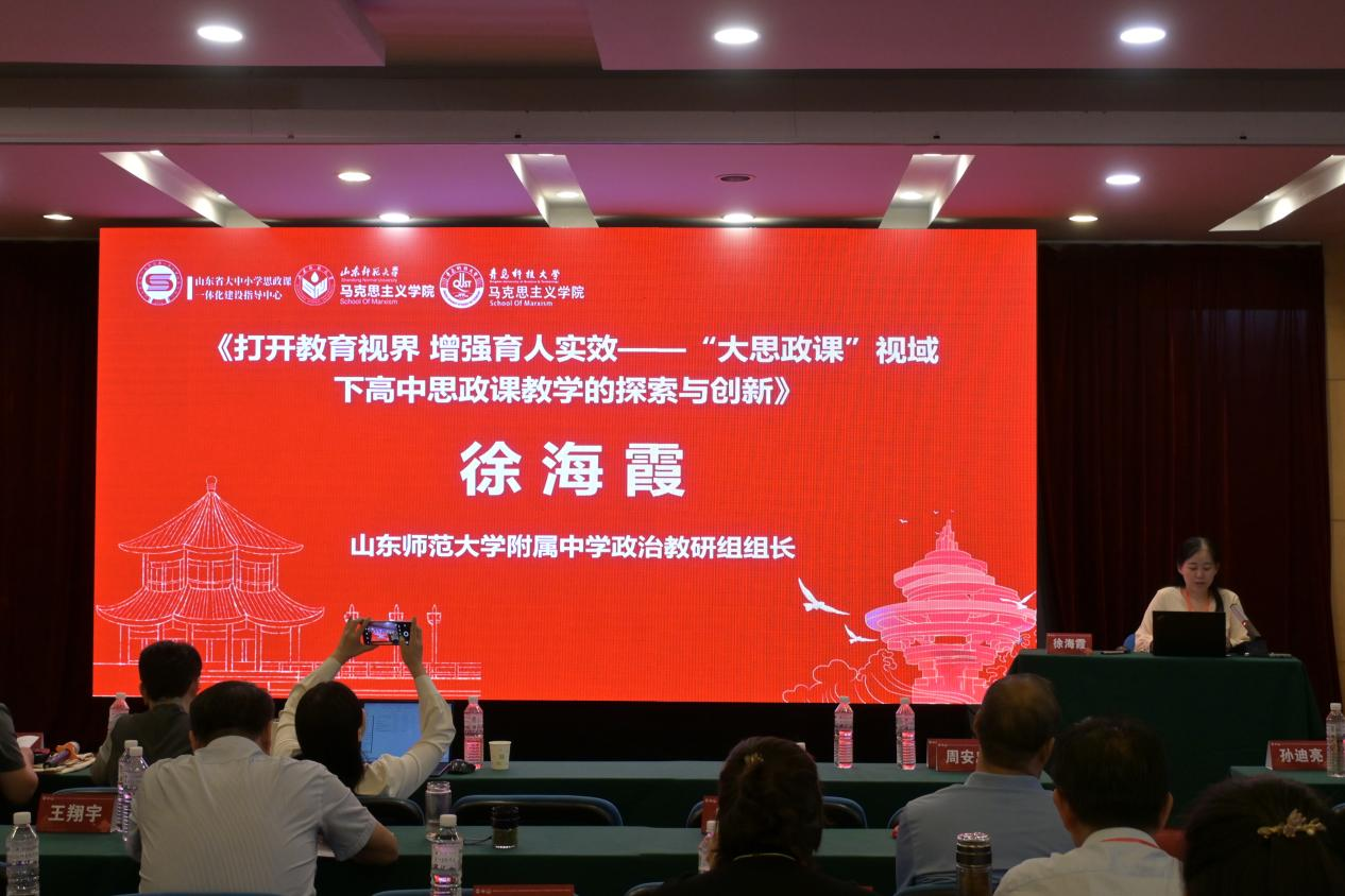 山東師范大學(xué)附屬中學(xué)政治教研組組長徐海霞以《打開教育視界增強育人實效——“大思政課”視域下高中思政課教學(xué)的探索與創(chuàng)新》為題發(fā)言