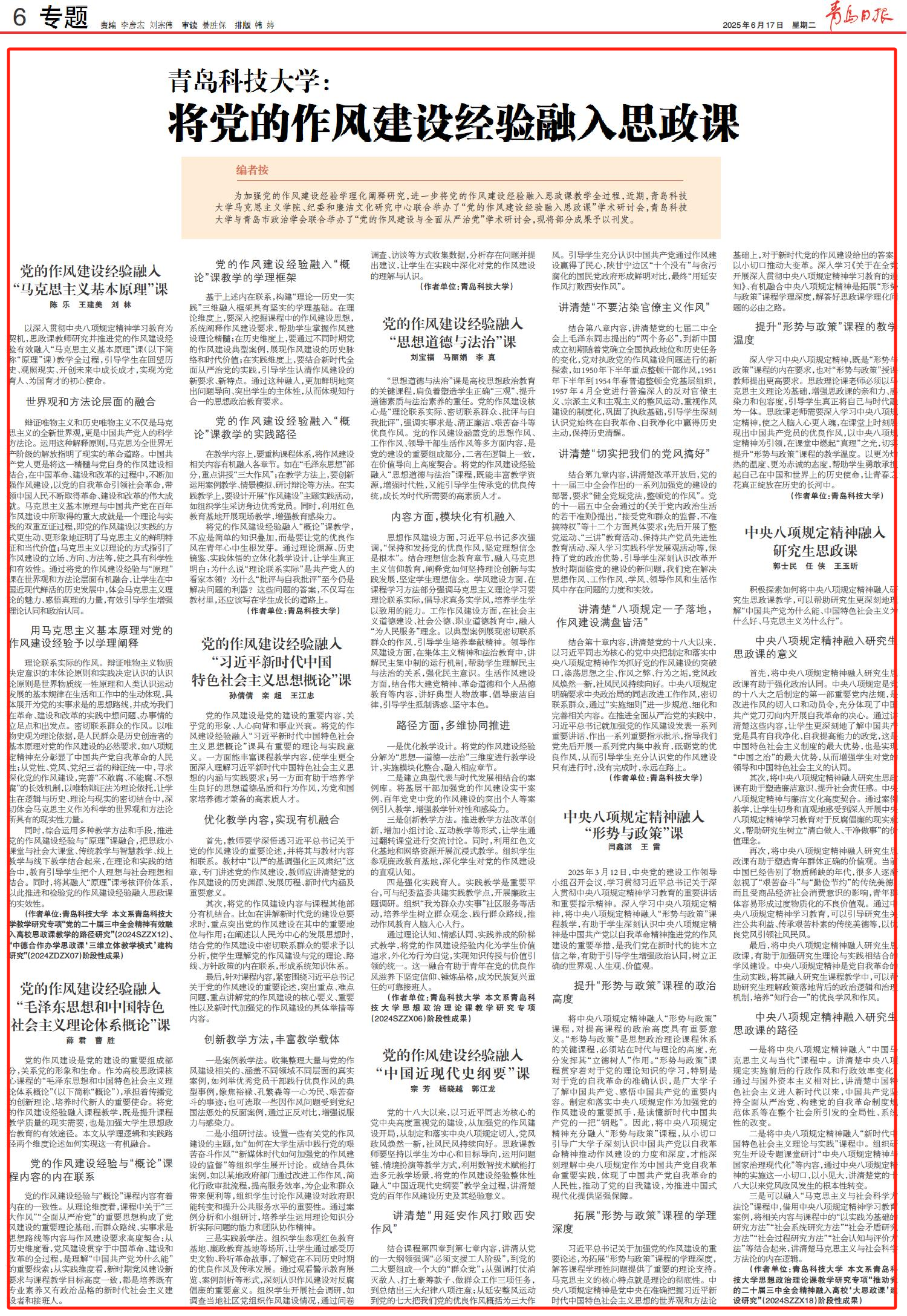 為加強(qiáng)黨的作風(fēng)建設(shè)經(jīng)驗學(xué)理化闡釋研究,進(jìn)一步將黨的作風(fēng)建設(shè)經(jīng)驗融入思政課教學(xué)全過程,近期,青島科技大學(xué)馬克思主義學(xué)院、紀(jì)委和廉潔文化研究中心聯(lián)合舉辦了“黨的作風(fēng)建設(shè)經(jīng)驗融入思政課”學(xué)術(shù)研討會,青島科技大學(xué)與青島市政治學(xué)會聯(lián)合舉辦了“黨的作風(fēng)建設(shè)與全面從嚴(yán)治黨”學(xué)術(shù)研討會,現(xiàn)將部分成果予以刊發(fā)。
