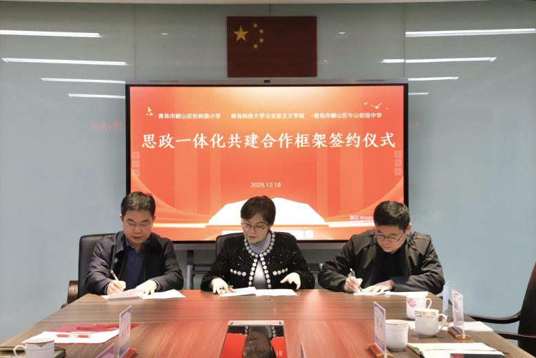 12月18日下午,馬克思主義學(xué)院與松嶺路小學(xué)、午山初級(jí)中學(xué)舉行大中小學(xué)思政課一體化共建合作框架簽約儀式。馬克思主義學(xué)院黨委書記李卉、副院長王建美,嶗山區(qū)松嶺路小學(xué)校長林先鋒以及午山初級(jí)中學(xué)校長陳余彬出席活動(dòng)。