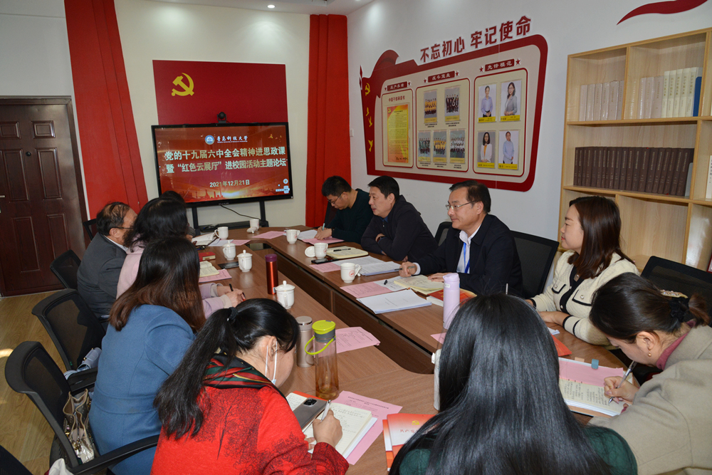 12月21日上午,學(xué)校在馬克思主義學(xué)院舉辦推進(jìn)黨的十九屆六中全會(huì)精神進(jìn)思政課研討會(huì)暨“紅色云展廳”進(jìn)校園活動(dòng)主題論壇。黨委副書記張鴻波出席會(huì)議并講話,黨委常委、宣傳部部長(zhǎng)陳剛主持。教務(wù)處、馬克思主義學(xué)院等相關(guān)部門、學(xué)院負(fù)責(zé)人,思政課教研室主任參加活動(dòng)。