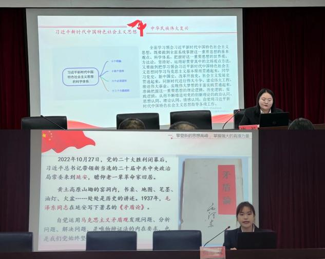 賈夢雙以“闊步新時代新征程,攀登新的思想高峰”為題,以攀登新的思想高峰、堅持人民至上、堅持黨的全面領(lǐng)導(dǎo)這三部分為主體內(nèi)容,呼吁大家堅持不懈用習(xí)近平新時代中國特色社會主義思想堅定理想信念,鑄牢政治品格,站穩(wěn)人民立場,不斷奪取新時代中國特色社會主義新勝利。