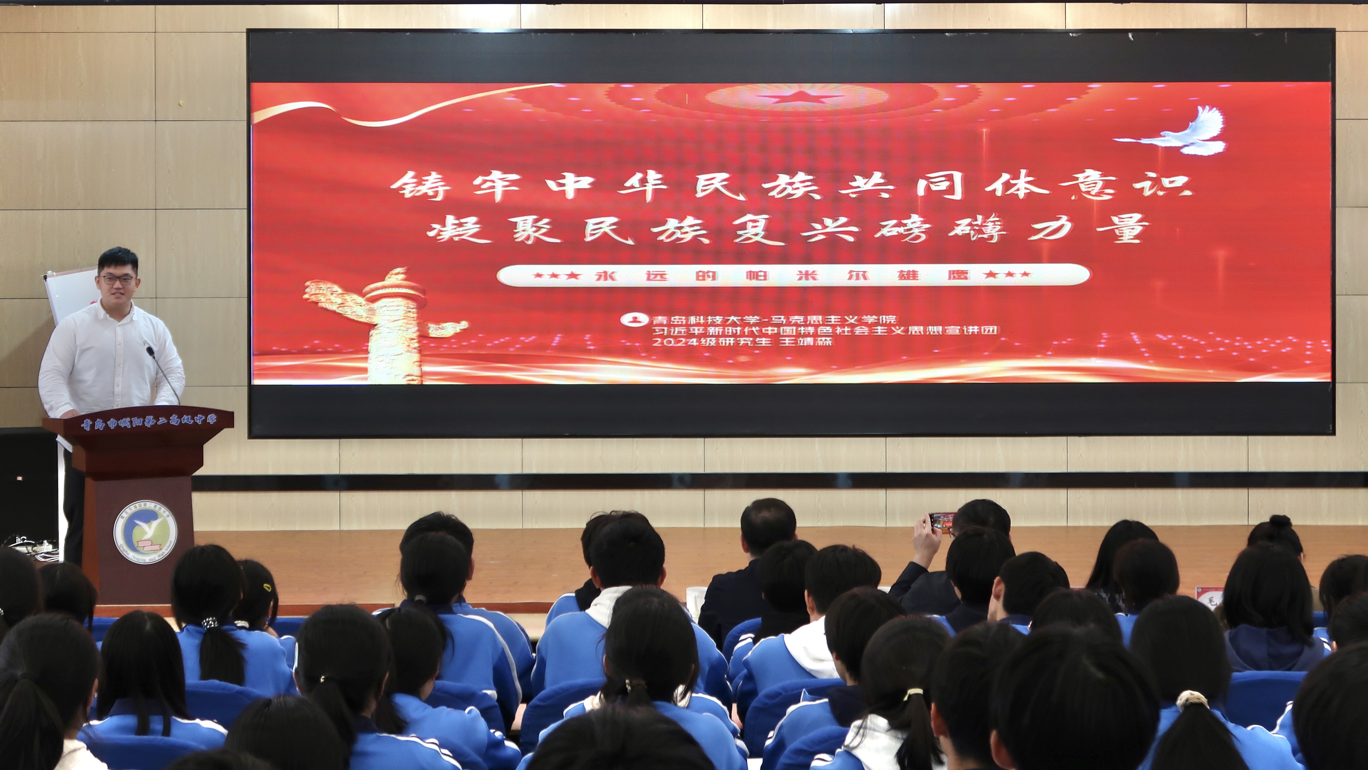 為深入學習貫徹黨的二十屆三中全會精神,引導青年堅定理想信念、緊跟黨走,在黨的領導與感召下勇?lián)鷼v史責任,10月26日下午,馬克思主義學院習近平新時代中國特色社會主義思想宣講團赴青島市城陽第二高級中學開展“深悟立法內(nèi)涵 厚植愛國主義”主題宣講活動。城陽第二高級中學副校長肖吉萃、校團委書記毛文靜,青島科技大學馬克思主義學院副院長郭江龍、馬克思主義中國化教研室副主任欒超出席本次活動,城陽第二高級中學團干部代表和入團積極分子參與本次活動。