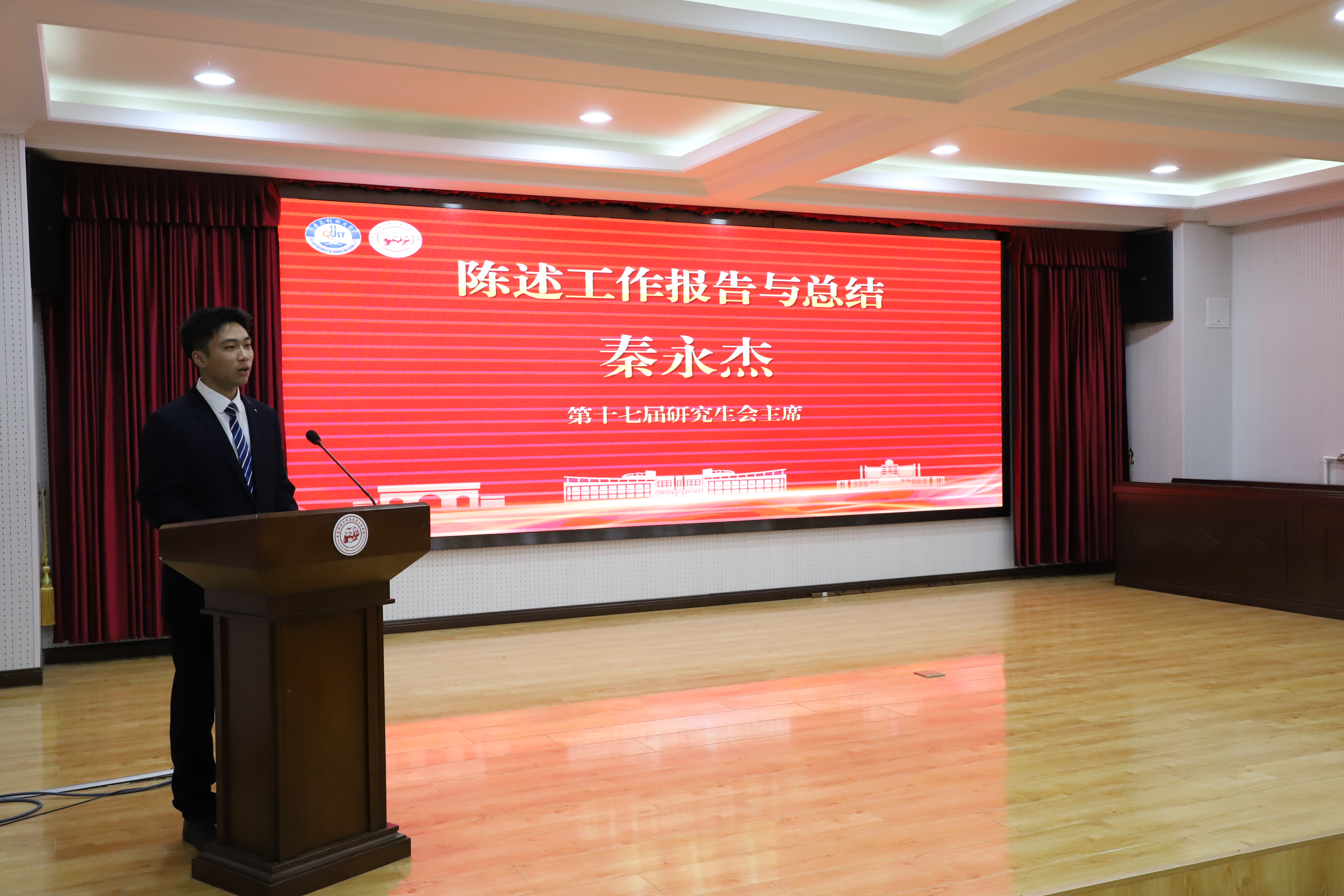 第十七屆研究生會執(zhí)行主席秦永杰代表第十七屆研究生會作工作報告與總結(jié),向支持研究生會工作的領(lǐng)導、老師和同學們表示衷心感謝,并寄語新一屆成員傳承優(yōu)良作風,續(xù)寫發(fā)展新篇。
