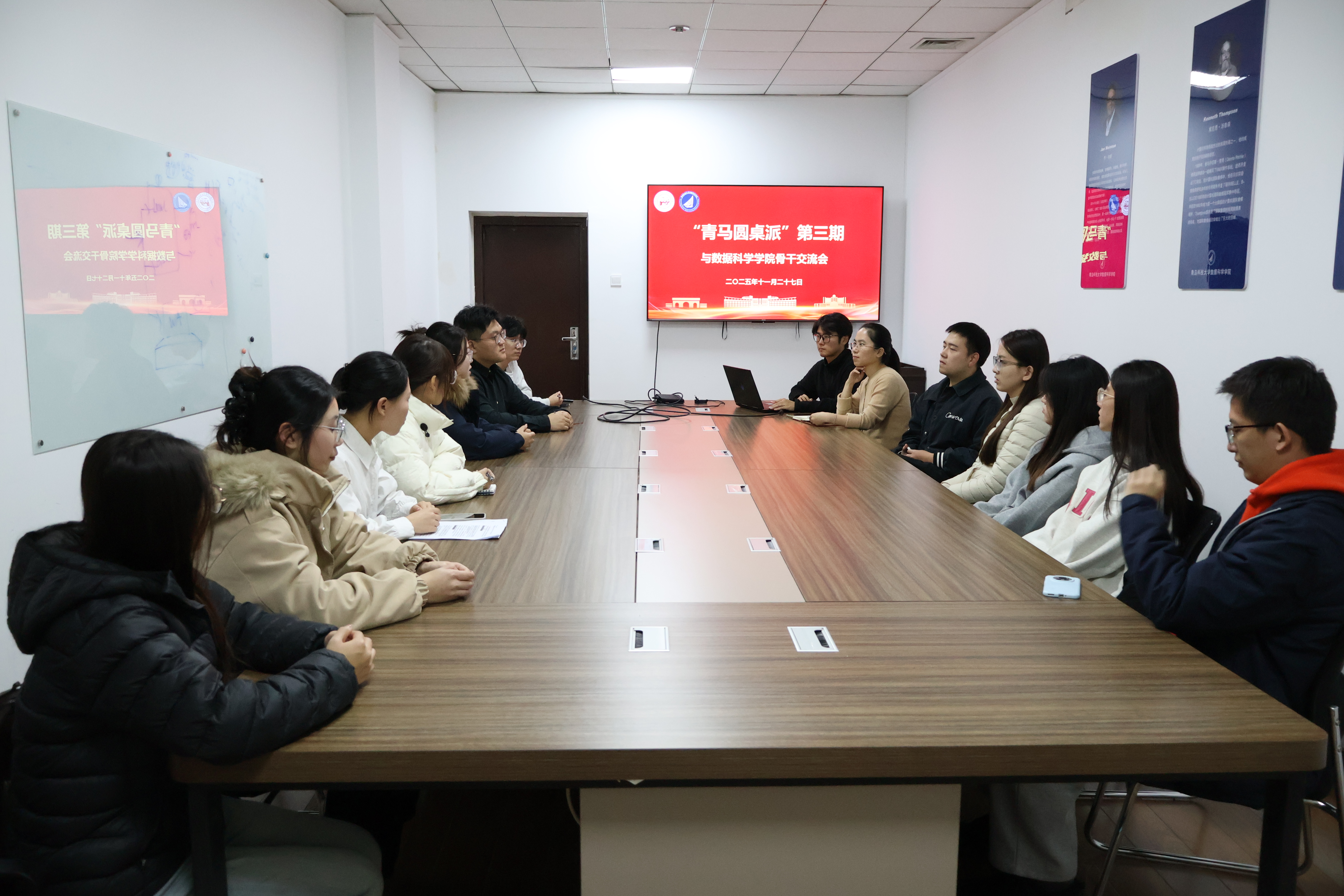 11月27日下午,馬克思主義學院“青馬圓桌派”第三期——與數(shù)據(jù)科學學院骨干交流會于數(shù)據(jù)科學學院4014室舉行。數(shù)據(jù)科學學院黨支部書記孫麗敏蒞臨指導,馬克思主義學院研究生會執(zhí)行主席王靖森、“理響”宣講團團長郭鈺,數(shù)據(jù)科學學院研究生會執(zhí)行主席柴皓澤、講師團團長劉文淵出席,“理響”宣講團、數(shù)據(jù)科學學院講師團部分成員參加。
