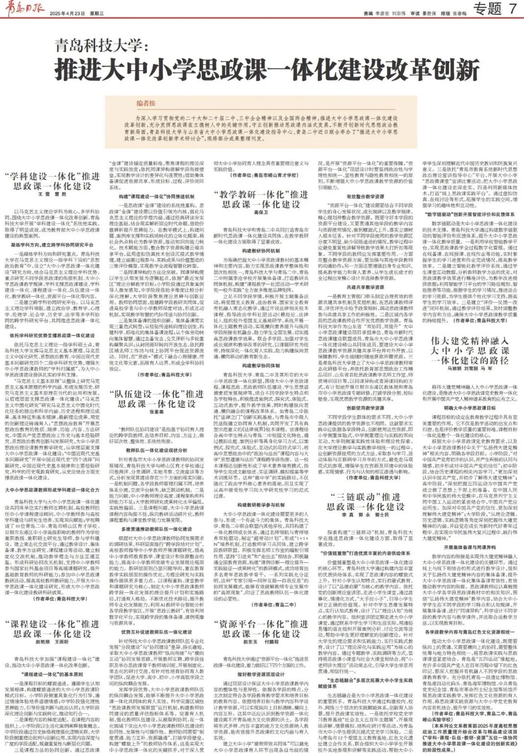 以馬克思主義理論學(xué)科為核心,多學(xué)科協(xié)同,圍繞大中小學(xué)思政課一體化改革創(chuàng)新,青島科技大學(xué)開展“學(xué)科建設(shè)一體化”系統(tǒng)性實(shí)踐,取得了明顯成效,成為教育部大中小學(xué)思政課建設(shè)的典型案例。