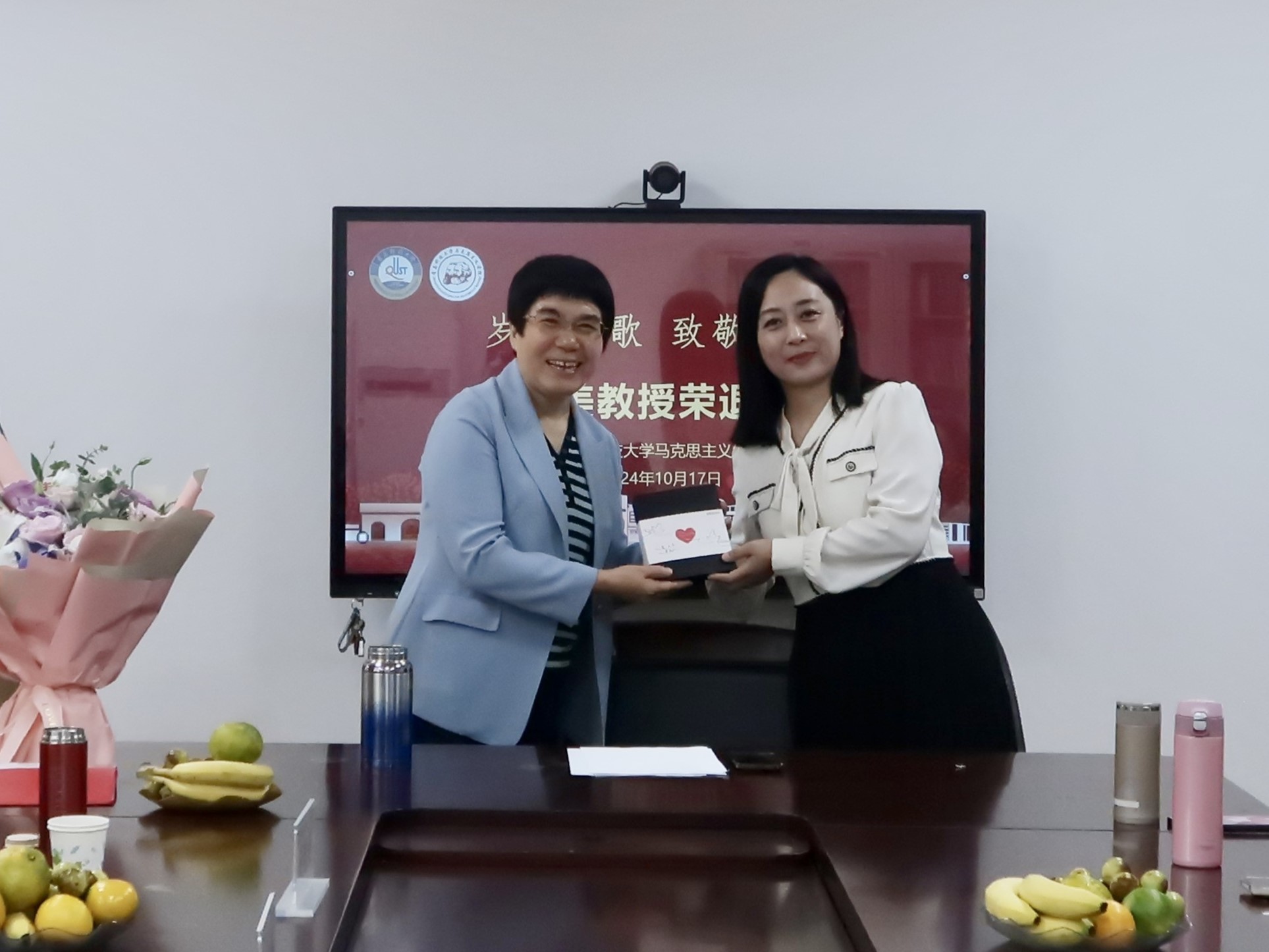 儀式上,工會(huì)主席姜竹青老師向龐桂美教授贈(zèng)送榮休紀(jì)念品,2007級(jí)研究生馬楠和2023級(jí)研究生張琪為龐桂美教授獻(xiàn)上鮮花。