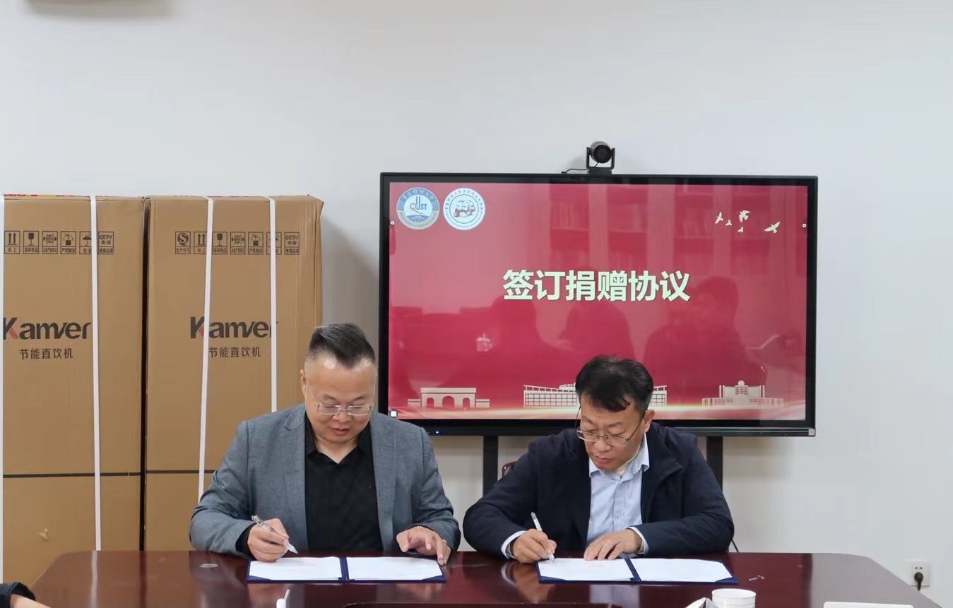 儀式上,青島科技大學(xué)馬克思主義學(xué)院黨總支書(shū)記李真與青島凱美爾飲水設(shè)備有限公司董事長(zhǎng)肖安平簽訂捐贈(zèng)協(xié)議。
