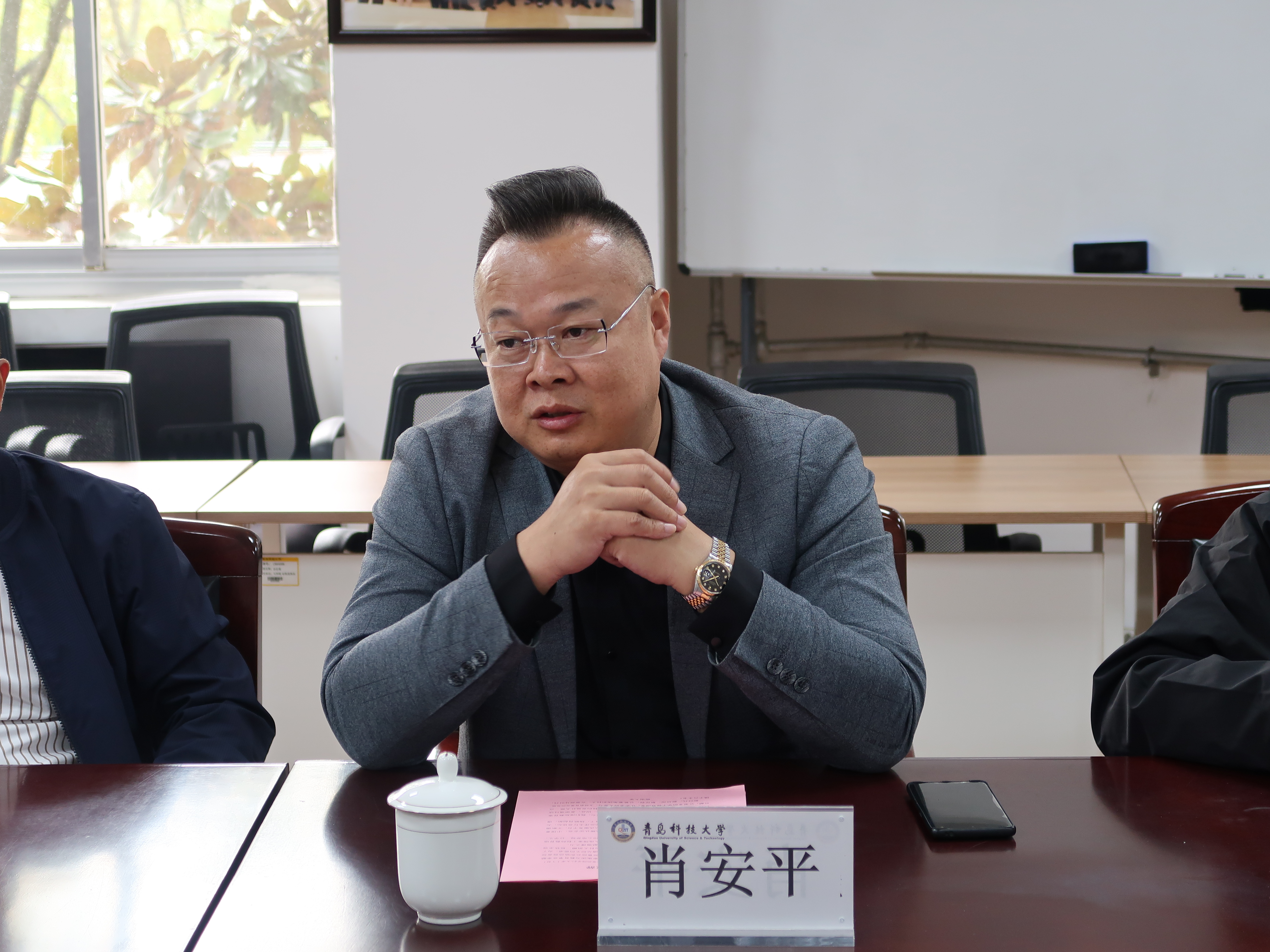 曹勝在致辭中首先向青島臨邑商會(huì)、青島凱美爾飲水設(shè)備有限公司表示感謝并介紹了學(xué)院基本情況。他表示,青島臨邑商會(huì)作為一個(gè)極具社會(huì)責(zé)任感的社團(tuán)組織,帶動(dòng)了一大批企業(yè)家在為經(jīng)濟(jì)發(fā)展作貢獻(xiàn)的同時(shí)積極地開(kāi)展公益事業(yè),體現(xiàn)出商會(huì)企業(yè)家們深入學(xué)習(xí)貫徹了二十屆三中全會(huì)精神,助力凝聚中國(guó)式現(xiàn)代化的磅礴之力。此次捐贈(zèng)之舉不僅能為青島科技大學(xué)的師生們營(yíng)造更為便捷的教學(xué)與學(xué)習(xí)環(huán)境,更是對(duì)馬克思主義學(xué)院教育工作的有力支持。希望未來(lái)能與青島臨邑商會(huì)、青島凱美爾飲水設(shè)備有限公司有更多交流機(jī)會(huì),開(kāi)展更多有效合作。