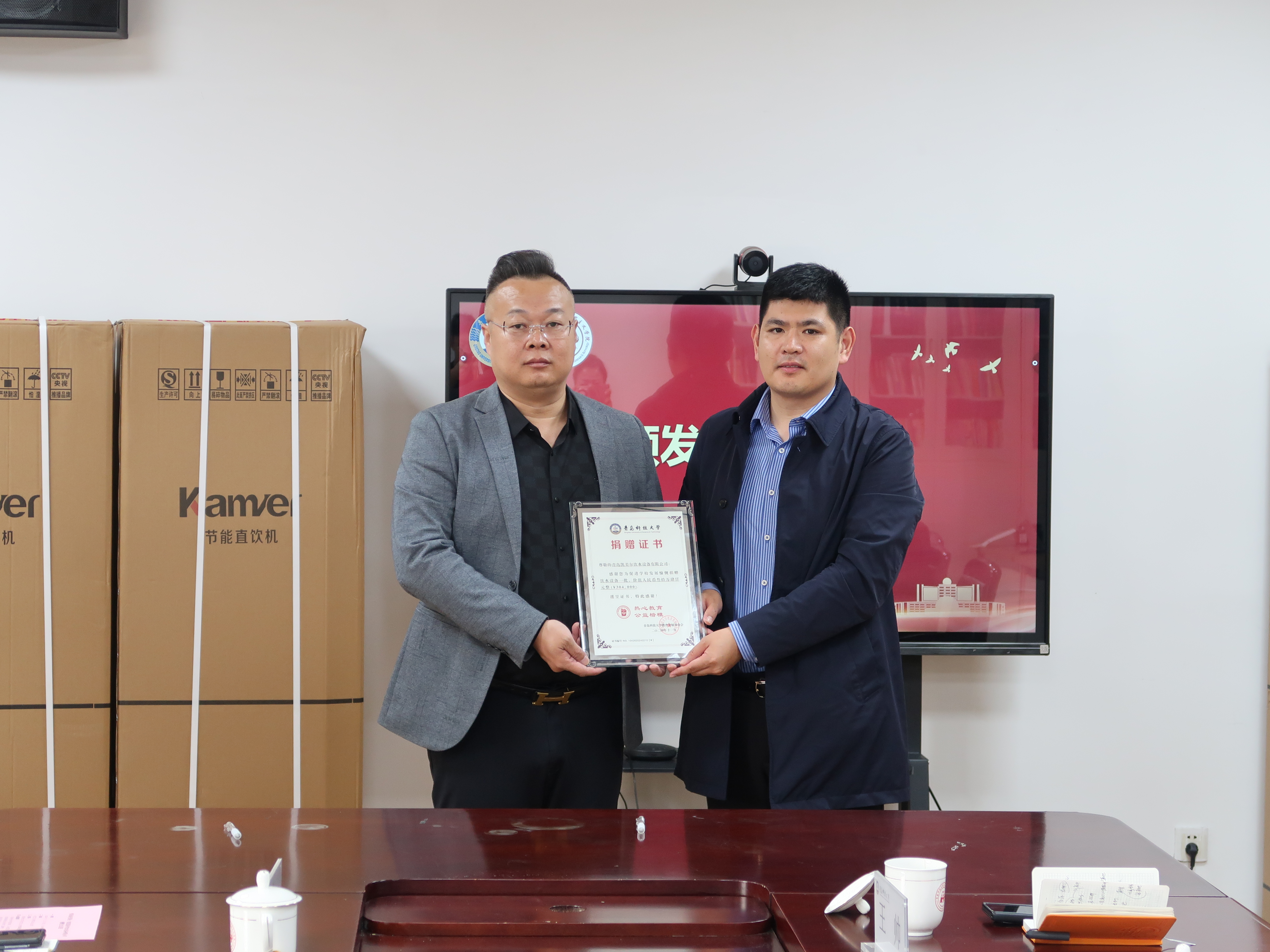 青島科技大學(xué)合作發(fā)展處處長(zhǎng)王帥為青島臨邑商會(huì)會(huì)長(zhǎng)鄭京衛(wèi)、青島凱美爾飲水設(shè)備有限公司董事長(zhǎng)肖安平頒發(fā)捐贈(zèng)證書(shū)。