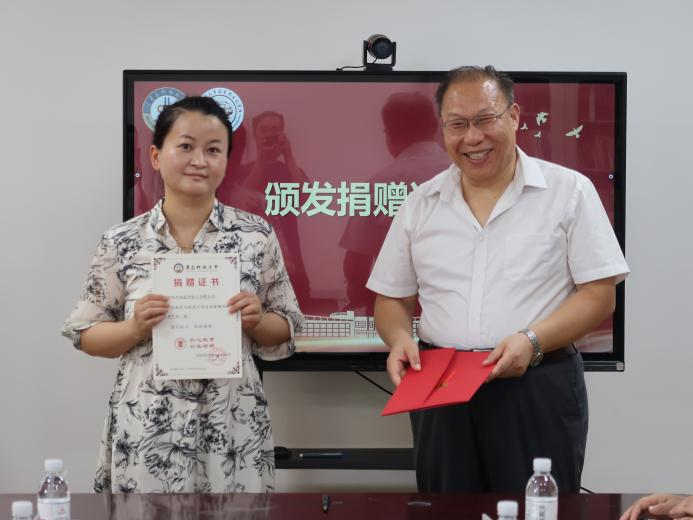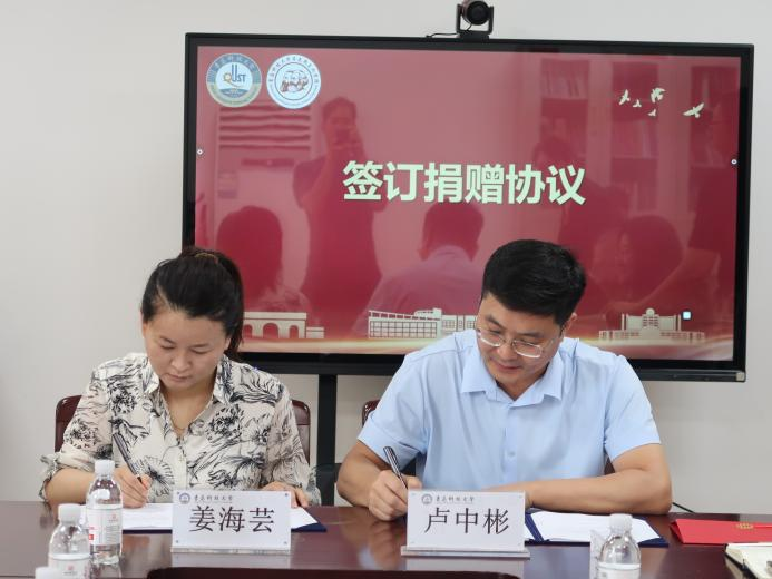 儀式上,青島泓川化工有限公司總經(jīng)理姜海蕓與青島科技大學(xué)合作發(fā)展處副處長兼校友辦公室副主任盧中彬簽訂捐贈(zèng)協(xié)議。