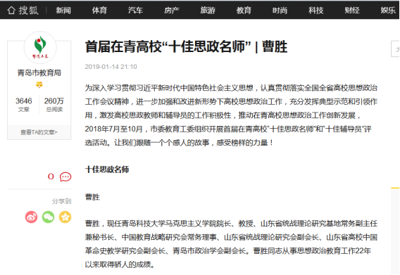 該同志主持建立了毛澤東思想網(wǎng)站、中國(guó)近現(xiàn)代史綱要網(wǎng)絡(luò)課堂、思想政治理論課專題網(wǎng)站等3個(gè)網(wǎng)站。曹勝所從事的思想政治理論課教育教學(xué)改革得到了省內(nèi)外專家的一致好評(píng),2010年在全國(guó)高校思想政治理論課骨干教師培訓(xùn)班上作典型發(fā)言,介紹教學(xué)科研經(jīng)驗(yàn),2011、2012、2014年在全省思想政治理論課教師培訓(xùn)班、暑期教學(xué)研討班上作經(jīng)驗(yàn)交流,其經(jīng)驗(yàn)、事跡被中國(guó)教育報(bào)、人民日?qǐng)?bào)、光明日?qǐng)?bào)、中國(guó)新聞網(wǎng)、山東新聞網(wǎng)、山東教育廳網(wǎng)站、大眾日?qǐng)?bào)、齊魯晚報(bào)、半島都市報(bào)、青島早報(bào)等媒體報(bào)道。