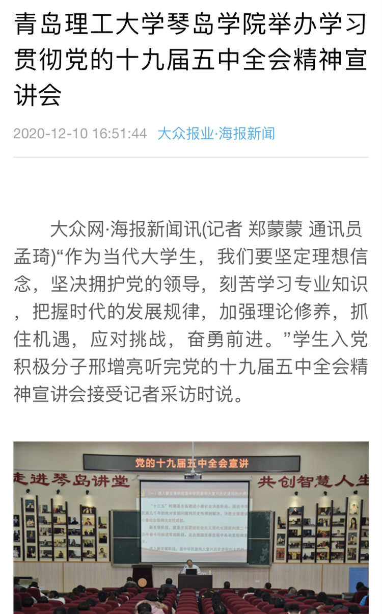 王樂生書記表示,學(xué)習(xí)貫徹落實(shí)黨的十九屆五中全會(huì)精神,是當(dāng)前和今后一個(gè)時(shí)期的重要政治任務(wù),要結(jié)合曹教授所做報(bào)告內(nèi)容,學(xué)深悟透全會(huì)精神,指導(dǎo)工作實(shí)踐,將個(gè)人理想,學(xué)院建設(shè),國家發(fā)展緊密結(jié)合,和琴島學(xué)院共同成長。“我們一起共同努力,謀劃好學(xué)院的‘十四五’發(fā)展規(guī)劃,計(jì)劃好自己的發(fā)展目標(biāo),堅(jiān)決落實(shí)立德樹人根本任務(wù),早日把琴島學(xué)院建設(shè)成為高水平應(yīng)用型大學(xué),為國家發(fā)展民族復(fù)興做出新貢獻(xiàn)。”