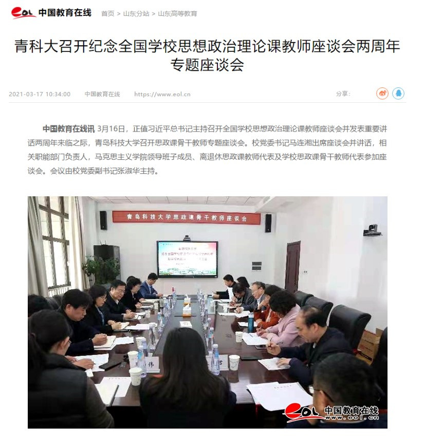 中國教育在線訊 3月16日,正值習(xí)近平總書記主持召開全國學(xué)校思想政治理論課教師座談會并發(fā)表重要講話兩周年來臨之際,青島科技大學(xué)召開思政課骨干教師專題座談會。校黨委書記馬連湘出席座談會并講話,相關(guān)職能部門負(fù)責(zé)人,馬克思主義學(xué)院領(lǐng)導(dǎo)班子成員、離退休思政課教師代表及學(xué)校思政課骨干教師代表參加座談會。會議由校黨委副書記張淑華主持。