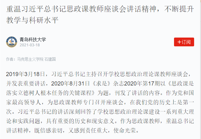 2019年3月18日,習(xí)近平總書記主持召開學(xué)校思想政治理論課教師座談會,并發(fā)表重要講話,2020年8月31日《求是》雜志2020年第17期以《思政課是落實立德樹人根本任務(wù)的關(guān)鍵課程》為題,刊發(fā)了講話的內(nèi)容。作為黨和國家最高領(lǐng)導(dǎo)人,為思政課教師專門召開座談會,在我們黨的歷史上是第一次。習(xí)近平總書記的講話深刻回答了學(xué)校思想政治理論課建設(shè)一系列重大理論和實踐問題,具有重要的歷史和現(xiàn)實意義。作為思政課教師,重溫習(xí)近平總書記重要講話精神,既倍感親切,又感到責(zé)任重大,使命光榮。
