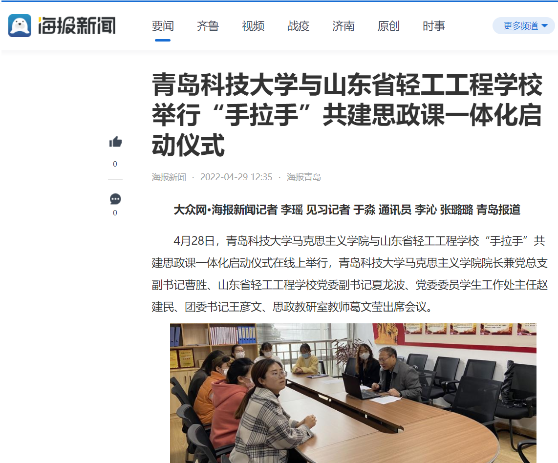 4月28日,青島科技大學(xué)馬克思主義學(xué)院與山東省輕工工程學(xué)校“手拉手”共建思政課一體化啟動儀式在線上舉行,青島科技大學(xué)馬克思主義學(xué)院院長兼黨總支副書記曹勝,山東省輕工工程學(xué)校黨委副書記夏龍波、黨委委員學(xué)生工作處主任趙建民、團(tuán)委書記王彥文、思政教研室教師葛文瑩出席會議。