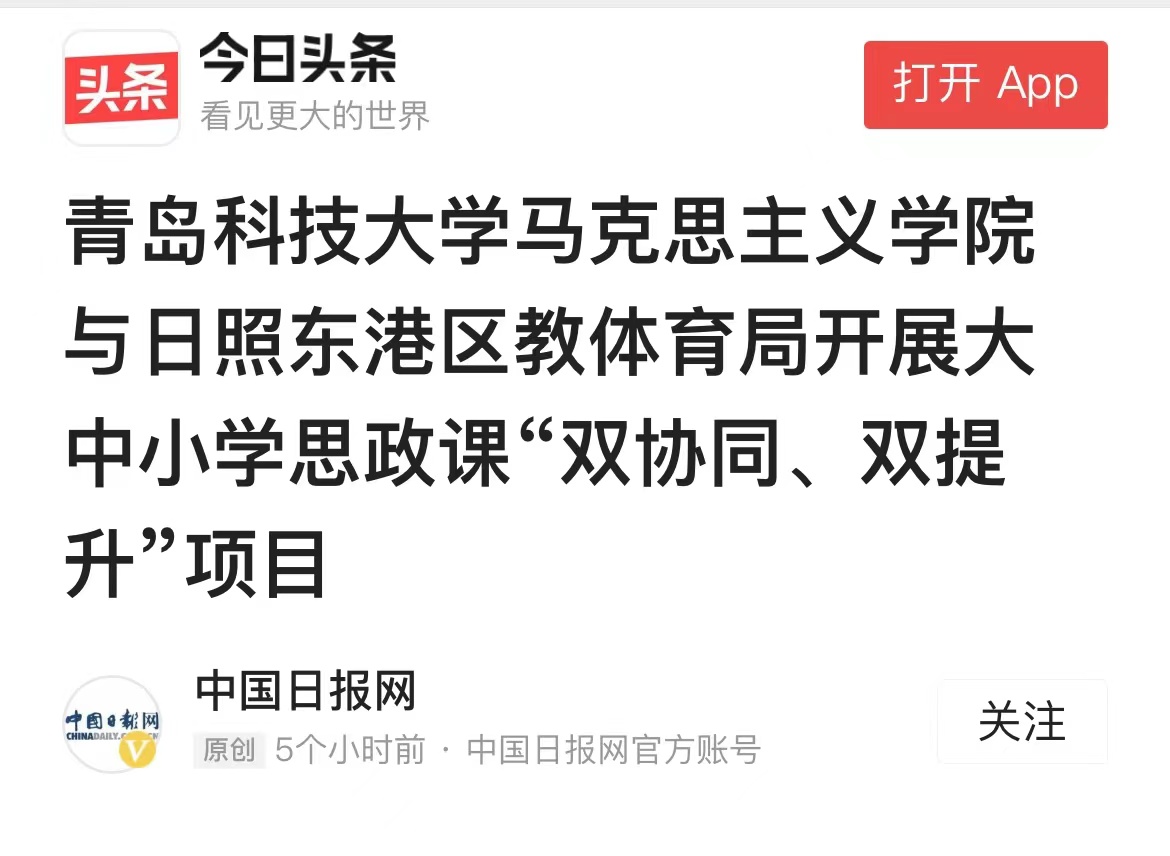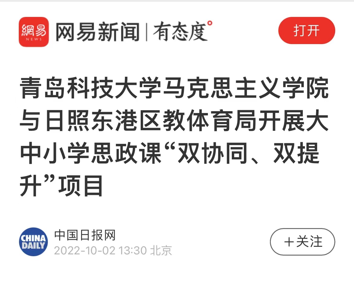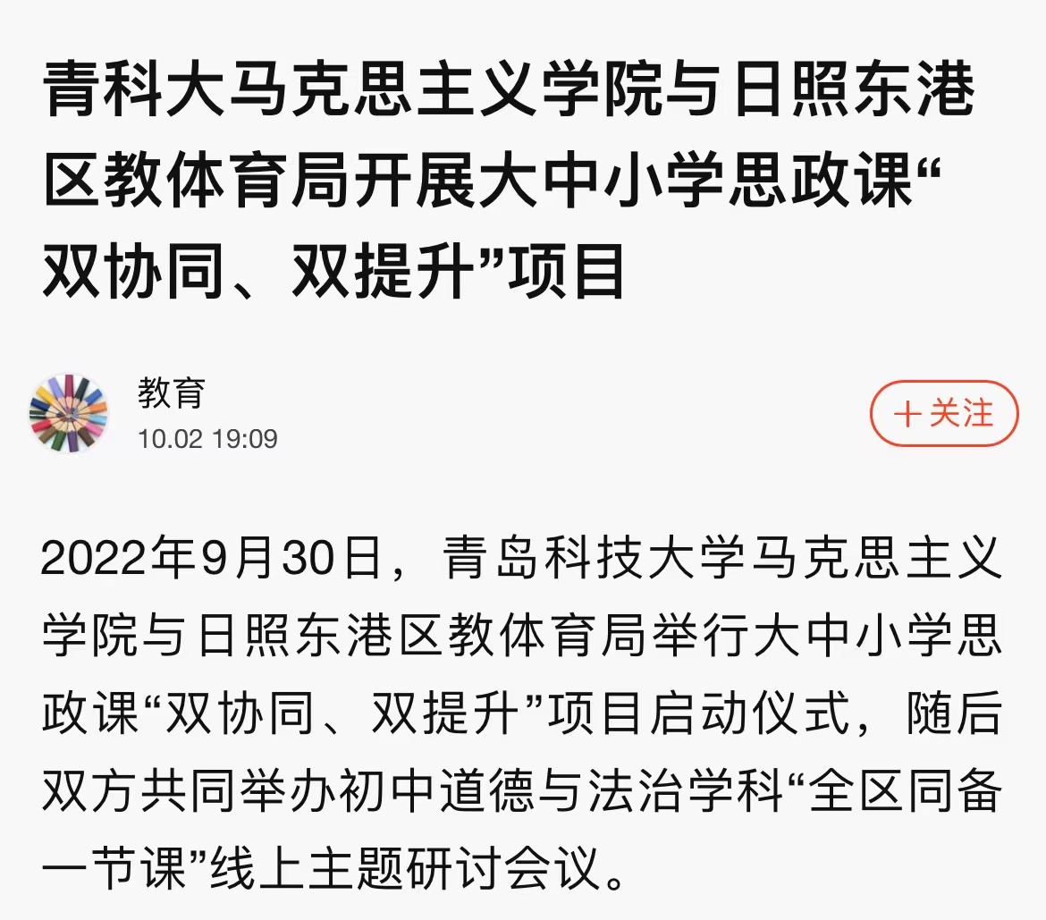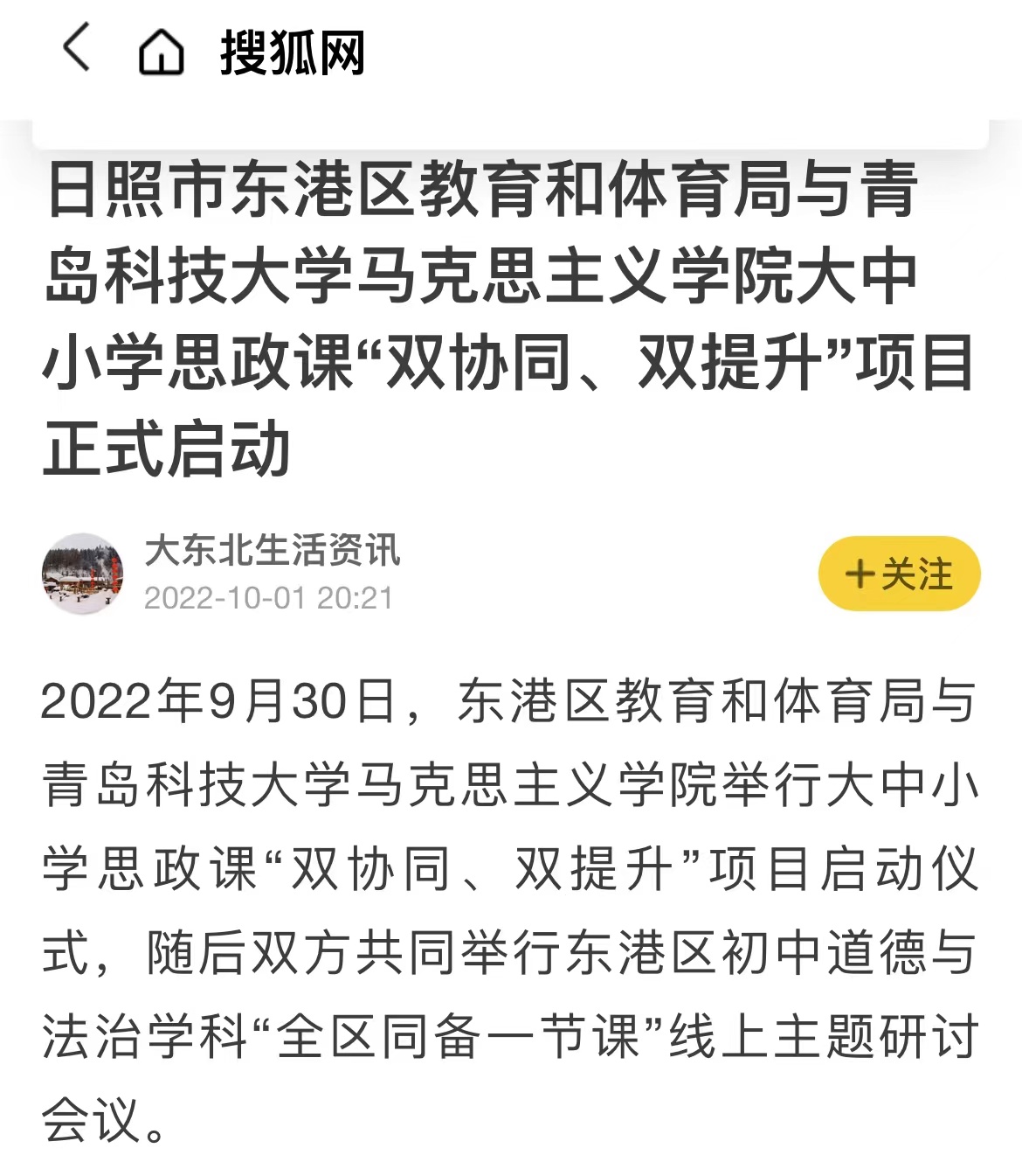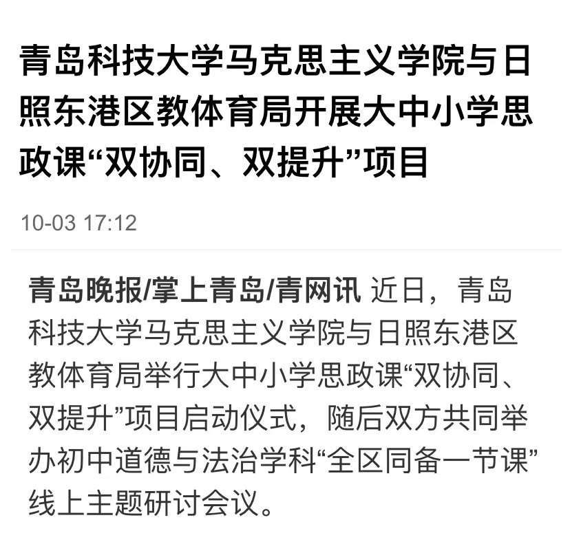 9月30日,青島科技大學(xué)馬克思主義學(xué)院與日照東港區(qū)教體育局大中小學(xué)思政課“雙協(xié)同、雙提升”項目正式啟動。據(jù)悉,雙方將在教學(xué)、科研、隊伍建設(shè)等方面的合作將全面展開。