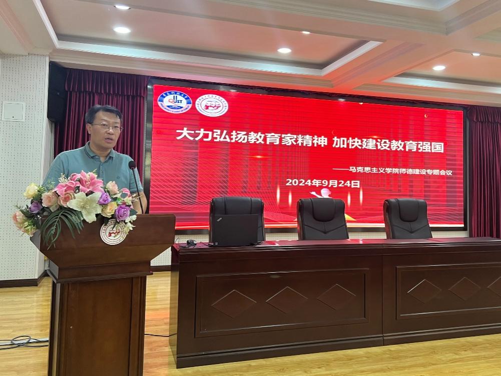 為深入學(xué)習(xí)貫徹黨的二十屆三中全會(huì)精神和全國教育大會(huì)精神,加強(qiáng)思政課教師師德師風(fēng)建設(shè),大力弘揚(yáng)教育家精神,緊緊圍繞著緊緊圍繞立德樹人根本任務(wù),加快建設(shè)教育強(qiáng)國,9月24日,青科大馬克思主義學(xué)院于學(xué)術(shù)報(bào)告廳舉辦“大力弘揚(yáng)教育家精神 加快建設(shè)教育強(qiáng)國”師德師風(fēng)建設(shè)專題會(huì)議,學(xué)院黨總支書記李真,院長曹勝,副院長郭江龍、王建美及全體教師參加了本次會(huì)議。會(huì)議由李真主持。