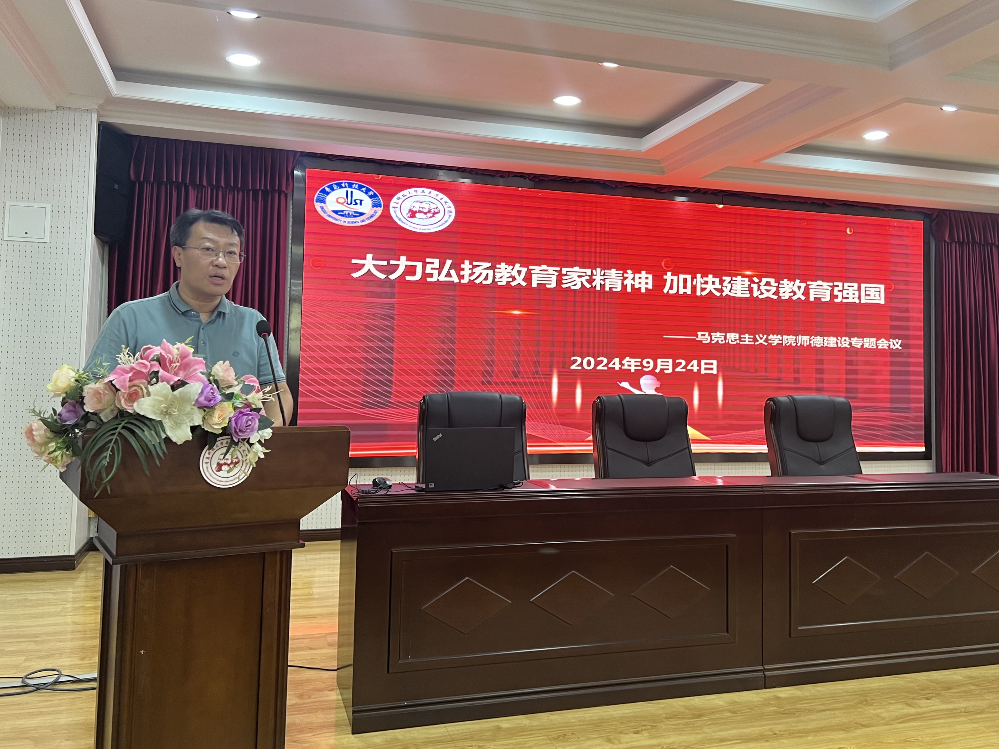 為深入學習貫徹黨的二十屆三中全會精神和全國教育大會精神,加強思政課教師師德師風建設(shè),大力弘揚教育家精神,緊緊圍繞著緊緊圍繞立德樹人根本任務(wù),加快建設(shè)教育強國,9月24日,青科大馬克思主義學院于學術(shù)報告廳舉辦“大力弘揚教育家精神 加快建設(shè)教育強國”師德師風建設(shè)專題會議,學院黨總支書記李真,院長曹勝,副院長郭江龍、王建美及全體教師參加了本次會議。會議由李真主持。