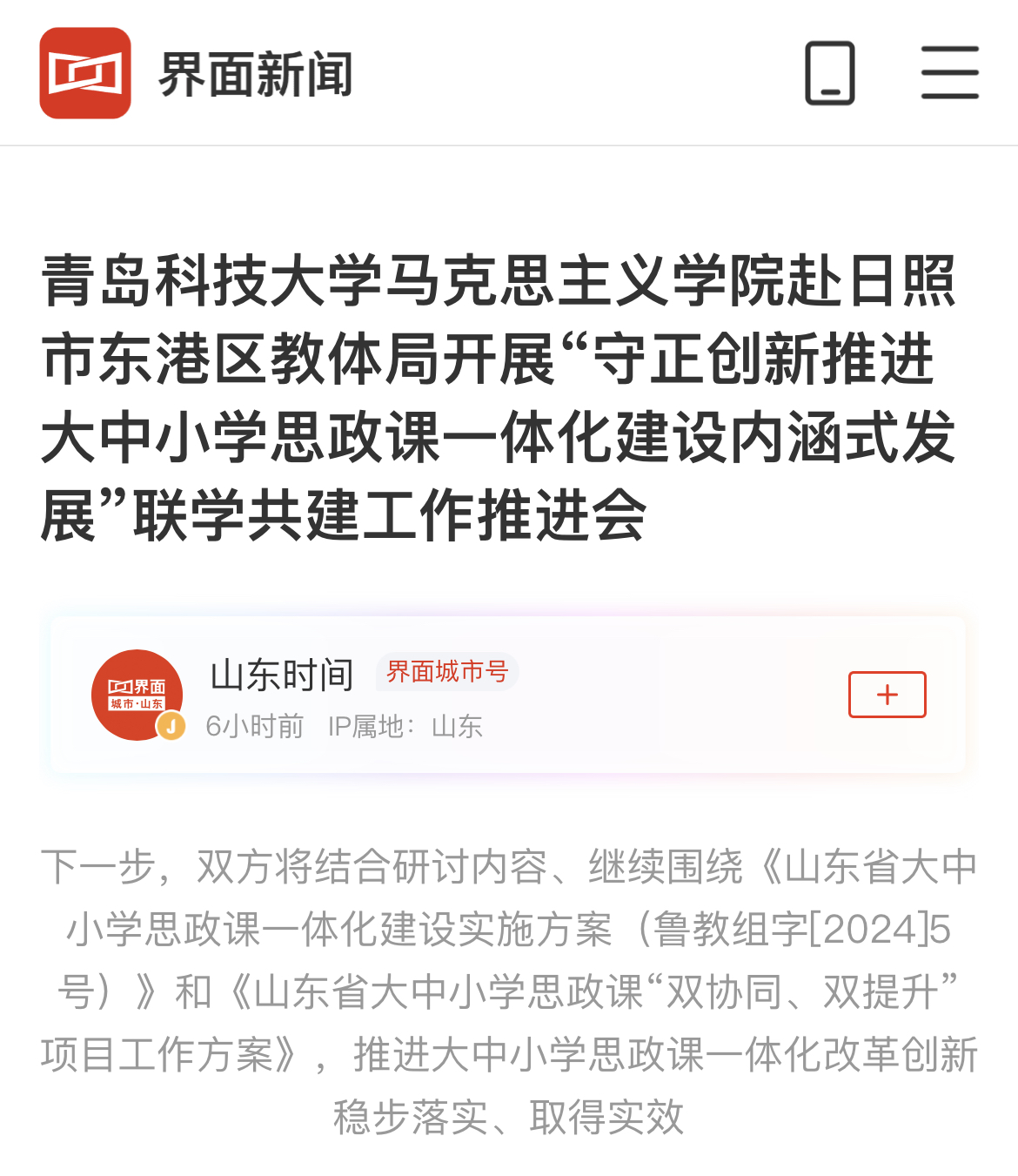在工作推進(jìn)會(huì)上,雙方共同學(xué)習(xí)了《山東省大中小學(xué)思政課一體化建設(shè)實(shí)施方案(魯教組字[2024]5號)》《山東省教育廳關(guān)于推廣泰安市創(chuàng)新推行“首課思政負(fù)責(zé)制”典型經(jīng)驗(yàn)的通知》,并充分研討。在學(xué)習(xí)與研討中,會(huì)議緊緊圍繞著如何認(rèn)真學(xué)習(xí)借鑒泰安市創(chuàng)新推行“首課思政負(fù)責(zé)制”典型經(jīng)驗(yàn),積極探索思政課改革創(chuàng)新,不斷提高思政課的針對性和吸引力;圍繞著如何推進(jìn)大中小學(xué)思政課一體化建設(shè)改革創(chuàng)新,實(shí)好新課程體系、深化大中小學(xué)思政課一體化教學(xué)改革創(chuàng)新、膠東紅色文化融入課程、共同上好一堂思政大課、促進(jìn)實(shí)踐育人項(xiàng)目融合發(fā)展等達(dá)成了一致共識。