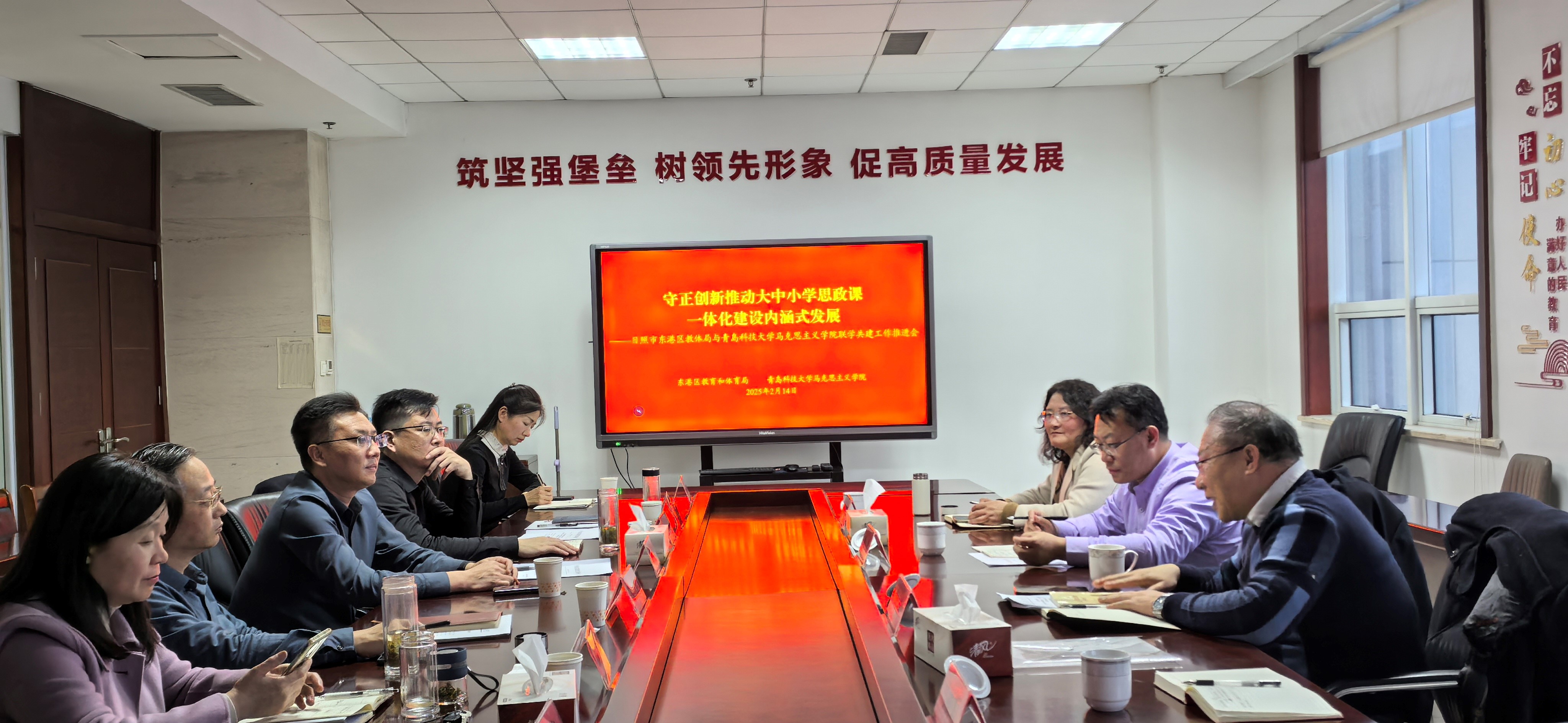 為深入貫徹落實習(xí)近平總書記關(guān)于大中小學(xué)思政課一體化建設(shè)講話精神、黨的二十屆三中全會精神和《教育強國建設(shè)規(guī)劃綱要(2024-2035年)》,推進大中小學(xué)思政課一體化改革創(chuàng)新,2025年2月14日,青島科技大學(xué)馬克思主義學(xué)院黨總支書記李真、院長曹勝、副院長王建美、思想道德與法治教研室黨支部書記馬麗娟赴日照市東港區(qū)教育和體育局就相關(guān)工作開展主題為“守正創(chuàng)新推進大中小學(xué)思政課一體化建設(shè)內(nèi)涵式發(fā)展”的聯(lián)學(xué)共建工作推進會。日照市東港區(qū)委教育工委常務(wù)副書記、區(qū)教體局黨組書記、局長宋磊,黨組成員、副局長卜立強,東港區(qū)教育科研和教師發(fā)展中心副主任匡立松,區(qū)各教研中心負責(zé)人、區(qū)中小學(xué)骨干教師代表等參加此次聯(lián)學(xué)共建工作推進會。