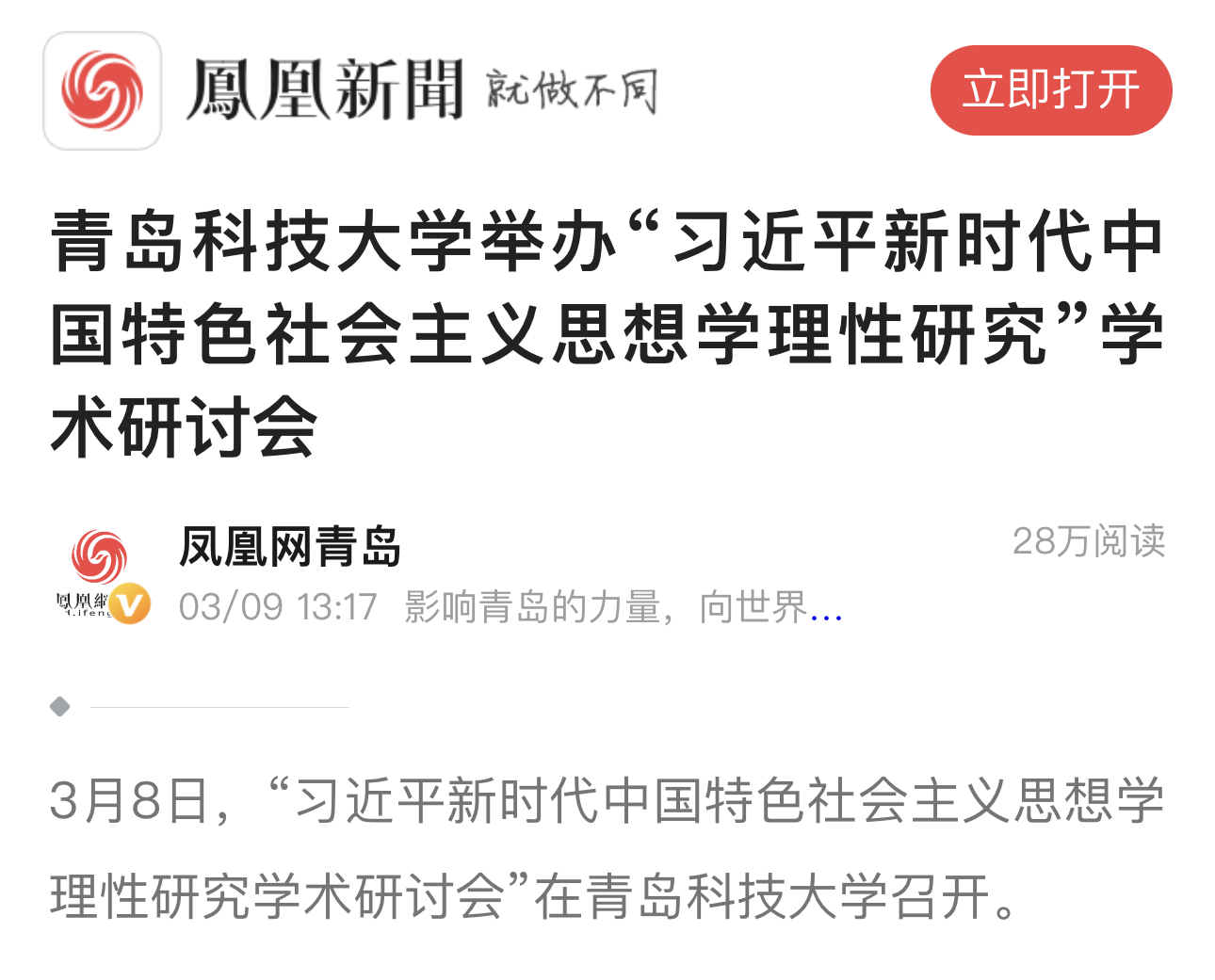 3月8日,“習(xí)近平新時(shí)代中國(guó)特色社會(huì)主義思想學(xué)理性研究學(xué)術(shù)研討會(huì)”在青島科技大學(xué)召開。會(huì)議由青島科技大學(xué)和青島市政治學(xué)會(huì)聯(lián)合舉辦,青島科技大學(xué)馬克思主義學(xué)院承辦。會(huì)議旨在充分發(fā)揮高校馬克思主義學(xué)院理論研究、學(xué)科支撐、人才資源等優(yōu)勢(shì),不斷深化對(duì)習(xí)近平新時(shí)代中國(guó)特色社會(huì)主義思想體系化、學(xué)理化研究,深入闡釋黨的創(chuàng)新理論科學(xué)內(nèi)涵和實(shí)踐要求,堅(jiān)持不懈用黨的創(chuàng)新理論最新成果武裝頭腦,建強(qiáng)馬克思主義理論學(xué)科,構(gòu)建學(xué)科體系、學(xué)術(shù)體系、話語(yǔ)體系。