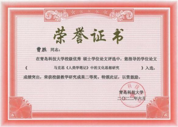 青島科技大學(xué)教學(xué)研究成果獎(jiǎng)二等獎(jiǎng):馬克思《人類學(xué)筆記》中的文化思想研究