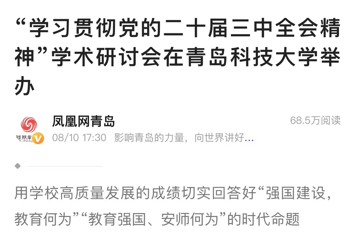 為學(xué)習(xí)貫徹黨的二十屆三中全會(huì)精神,深入研討全會(huì)精神的核心要義、豐富內(nèi)涵和實(shí)踐要求,8月10日,由山東省學(xué)校思政課教指委“思想道德與法治”“中國近現(xiàn)代史綱要”分教指委、青島市政治學(xué)會(huì)、青島科技大學(xué)聯(lián)合舉辦,青島科技大學(xué)馬克思主義學(xué)院承辦的“學(xué)習(xí)貫徹黨的二十屆三中全會(huì)精神”學(xué)術(shù)研討會(huì)在青島科技大學(xué)召開。來自山東省內(nèi)外高校專家學(xué)者和青年學(xué)生參加會(huì)議。