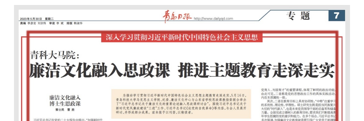 為推動學(xué)習(xí)貫徹習(xí)近平新時代中國特色社會主義思想主題教育走深走實,5月16日,青島科技大學(xué)馬克思主義學(xué)院、紀(jì)委、廉潔文化中心與山東省學(xué)校思政課教指委聯(lián)合舉辦了“習(xí)近平總書記關(guān)于廉潔文化的重要論述融入思政課研討會”。圍繞習(xí)近平總書記關(guān)于新時代黨風(fēng)廉政建設(shè)“三進”工作、習(xí)近平總書記《論黨的自我革命》等內(nèi)容,與會人員展開研討,并形成部分成果。茲本報予以刊登,以饗讀者。
