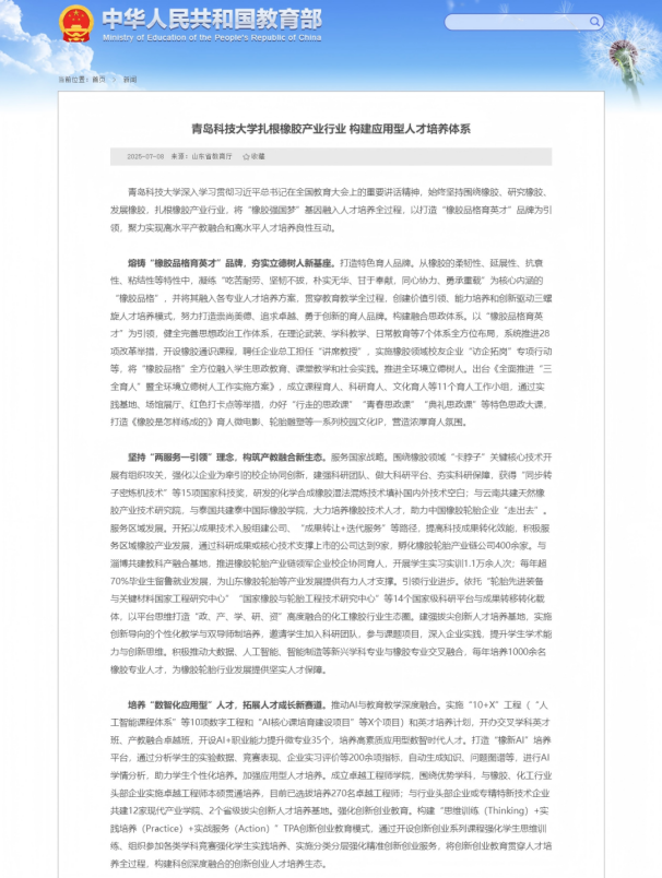 教育部官網(wǎng)《戰(zhàn)線聯(lián)播》欄目,以《青島科技大學(xué)扎根橡膠產(chǎn)業(yè)行業(yè) 構(gòu)建應(yīng)用型人才培養(yǎng)體系》為題,報(bào)道學(xué)校“橡膠品格育英才”人才培養(yǎng)特色,社會(huì)反響良好