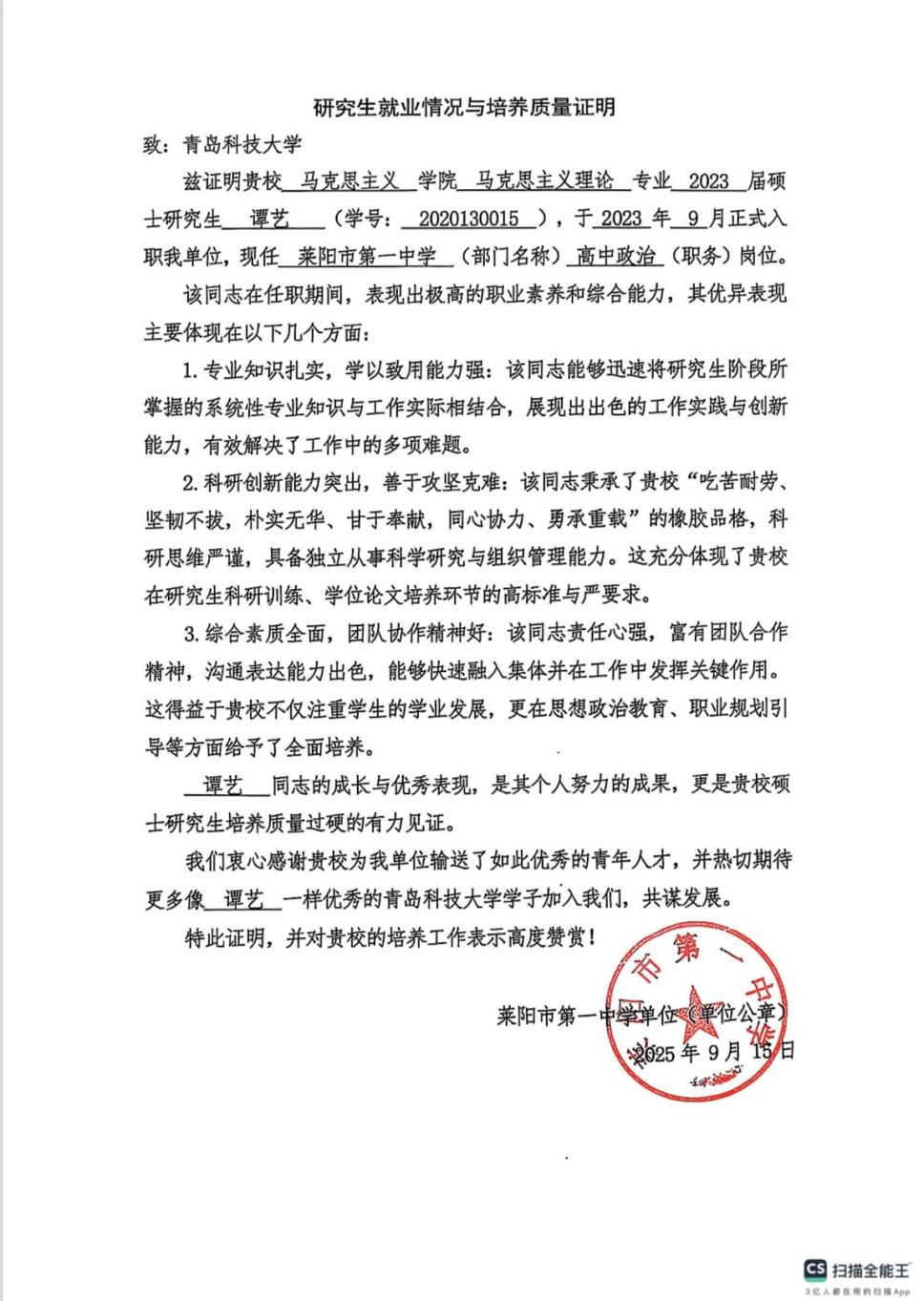 2023屆馬克思主義學院碩士畢業(yè)生譚藝入職萊陽市第一中學思政課教師崗位