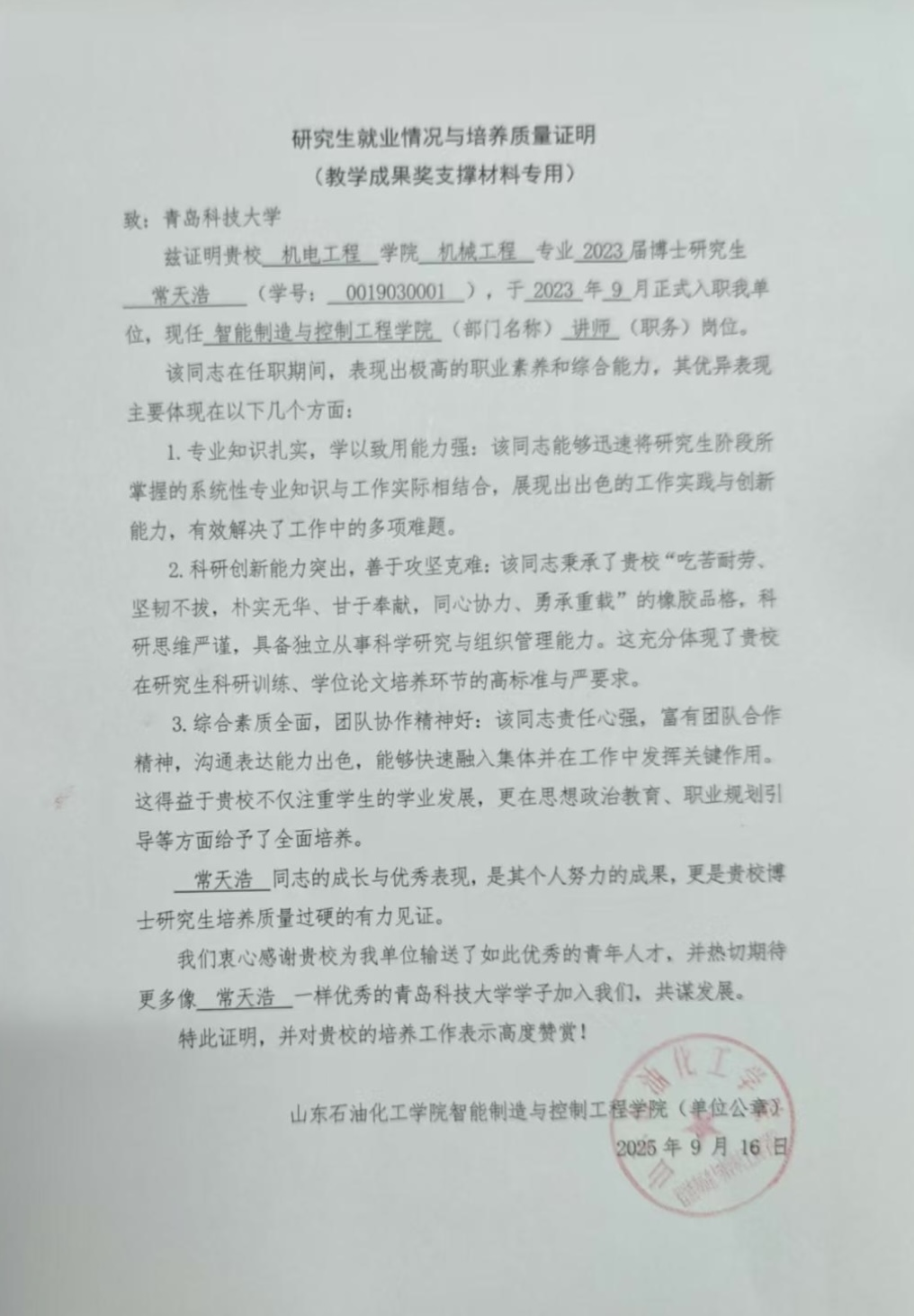 2023屆機(jī)電工程學(xué)院博士研究生常天浩入職山東石油化工學(xué)院智能制造與控制工程學(xué)院教師崗位