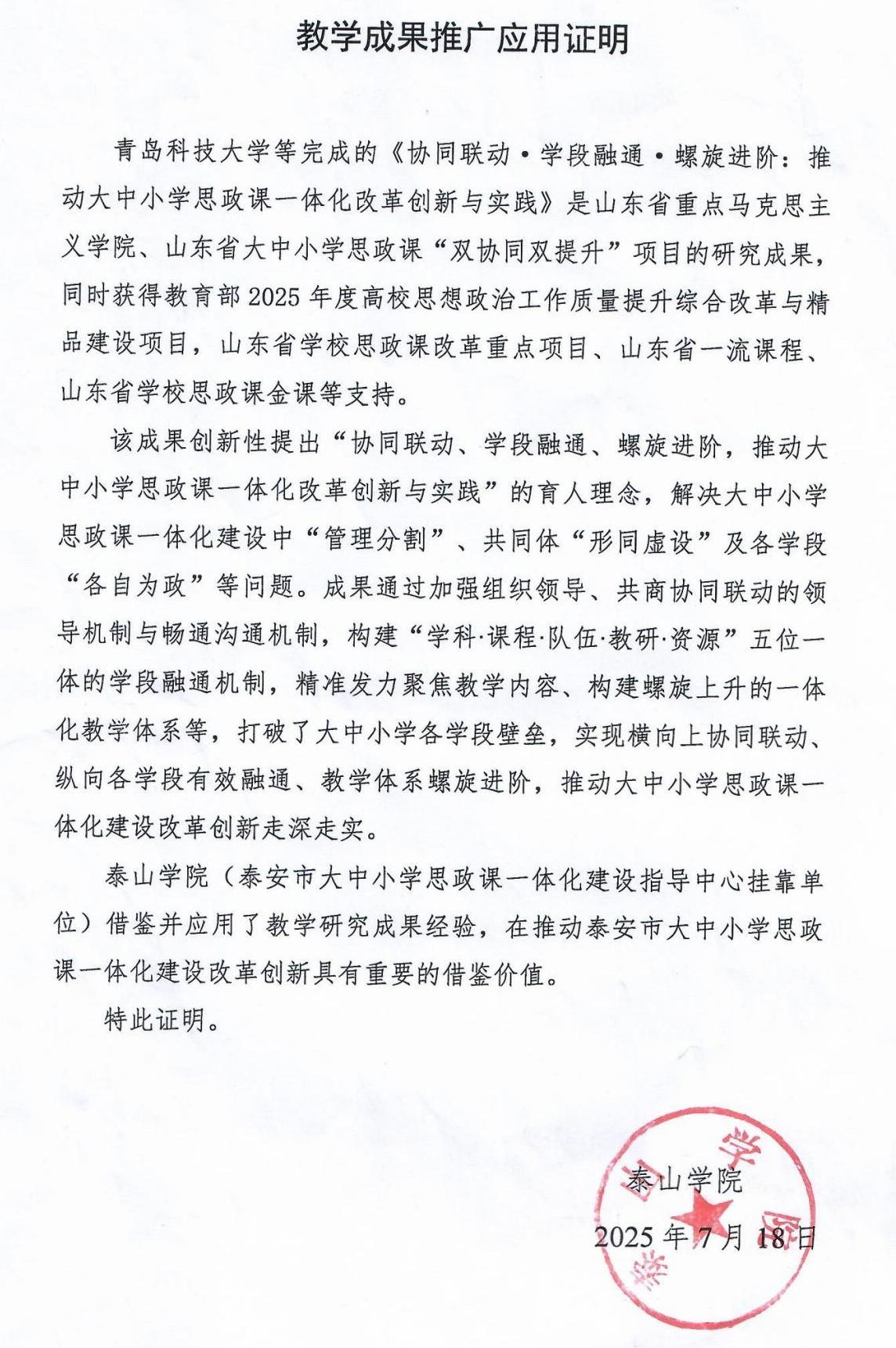 泰山學(xué)院教學(xué)成果推廣應(yīng)用證明