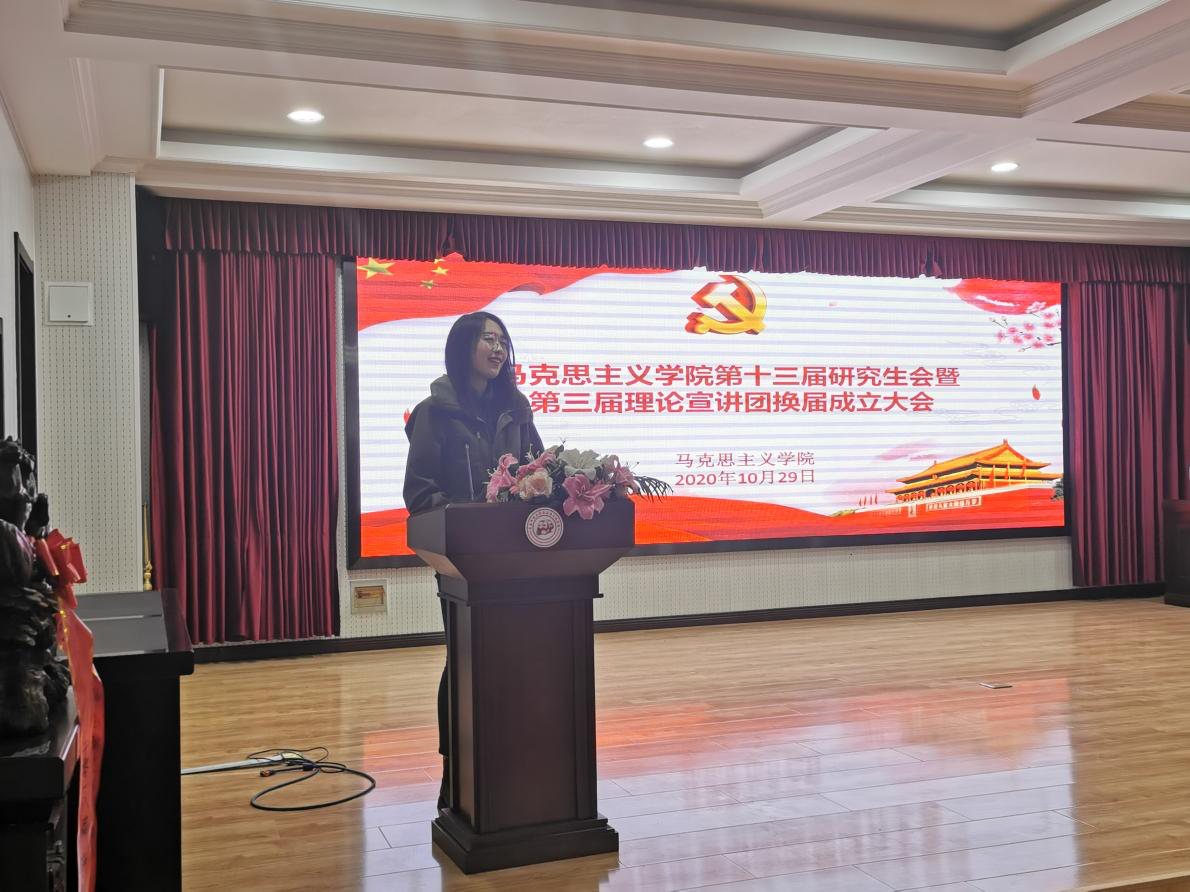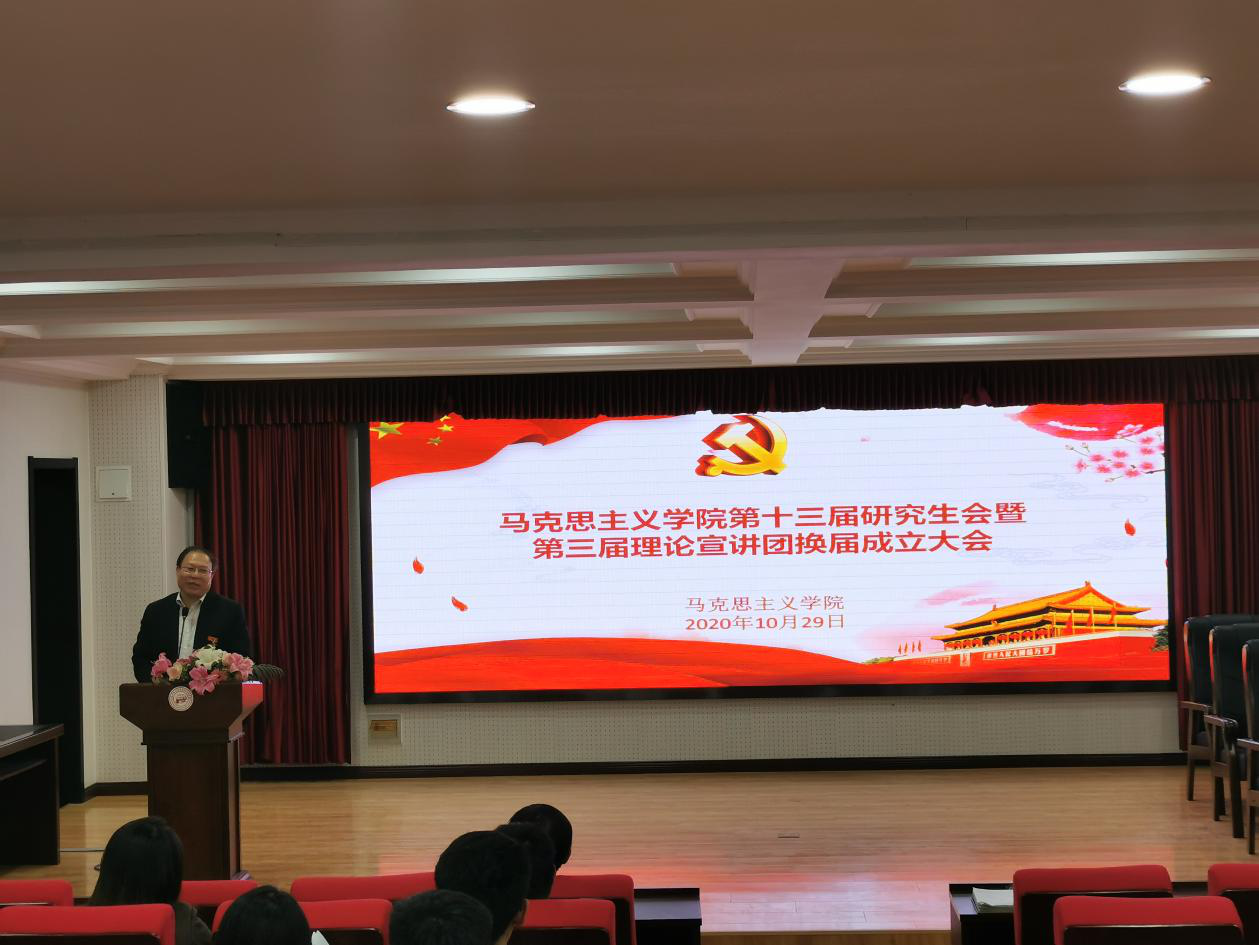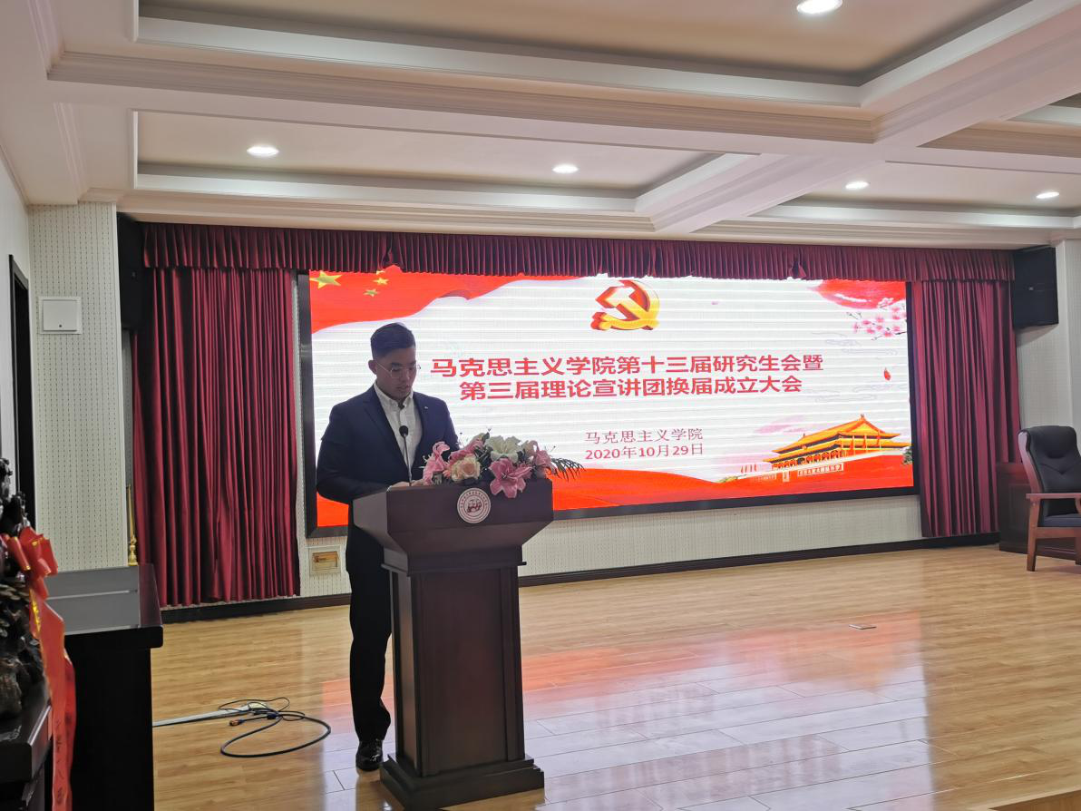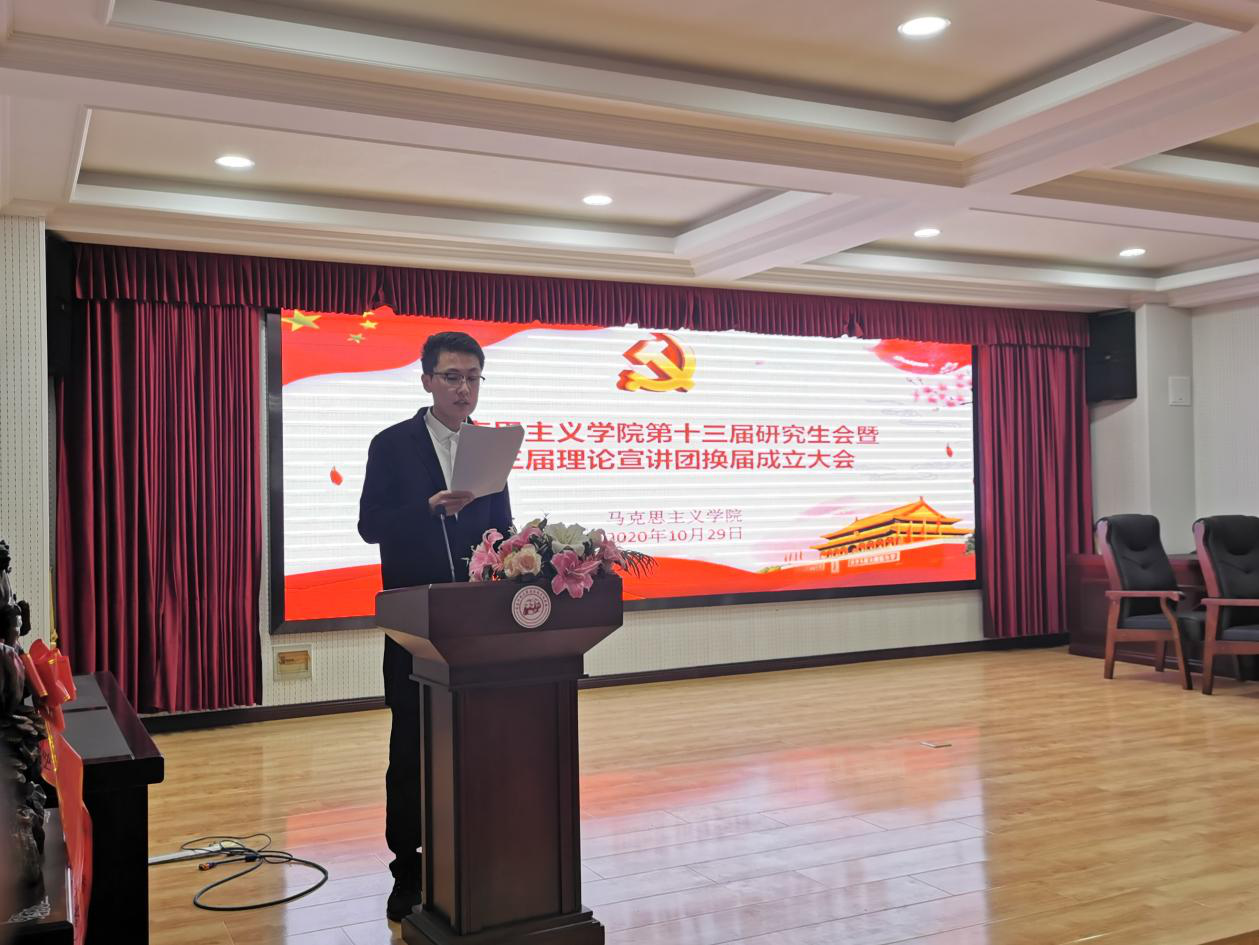2020年10月29日下午,馬克思主義學(xué)院在報(bào)告廳舉行第十三屆研究生會(huì)暨第三屆理論宣講團(tuán)換屆成立大會(huì)。馬克思主義學(xué)院黨總支書記張鳴、院長(zhǎng)曹勝、副院長(zhǎng)張運(yùn)君,馬克思主義學(xué)院第十二屆研究生會(huì)主席團(tuán)成員、各部門部長(zhǎng),第十三屆研究生會(huì)全體成員以及習(xí)近平新時(shí)代中國(guó)特色社會(huì)主義思想宣講團(tuán)全體成員參加活動(dòng)。本次活動(dòng)由2020級(jí)韓新怡主持。