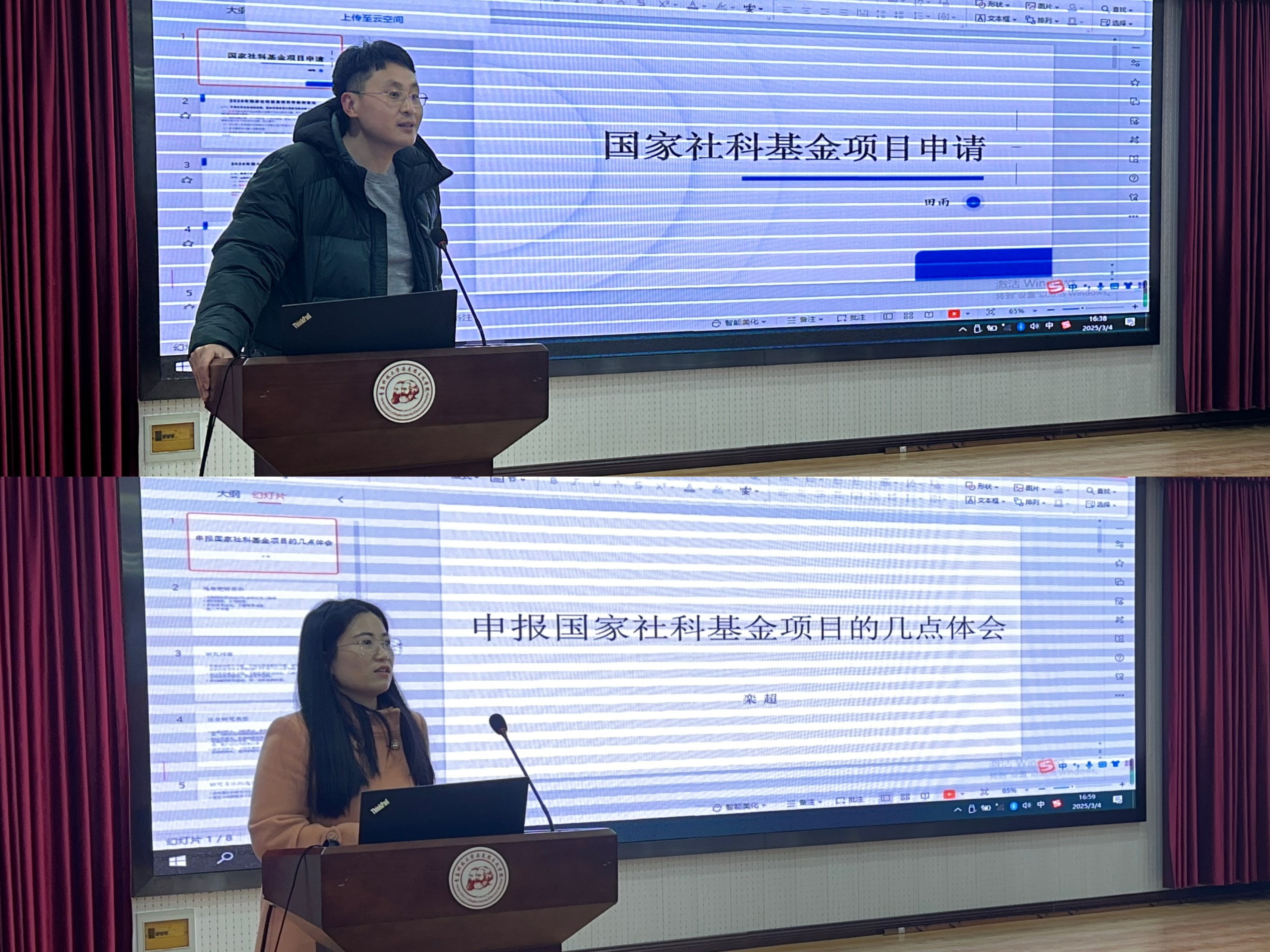 隨后,馬克思主義學院研究生黨支部書記田雨、馬克思主義中國化教研室副主任欒超分別作了國家社科基金項目的申報經驗分享。田雨強調,科研項目申請要把握以下三點:一是選題滿足國家戰(zhàn)略需求,找尋選題的價值和意義;二是追求創(chuàng)新性,把握好學術觀點創(chuàng)新和方法創(chuàng)新;三是可行性分析,以自身前期基礎為前提進行研究。欒超提出,在選題時要考慮學科互補、研究優(yōu)勢互補,選題不僅要符合國家大政方針,符合自身研究特點,還要有前沿性、創(chuàng)新性,注重論證、注重邏輯、注重細節(jié)。最后,學院各青年教師圍繞自身科研項目準備情況進行匯報與交流。