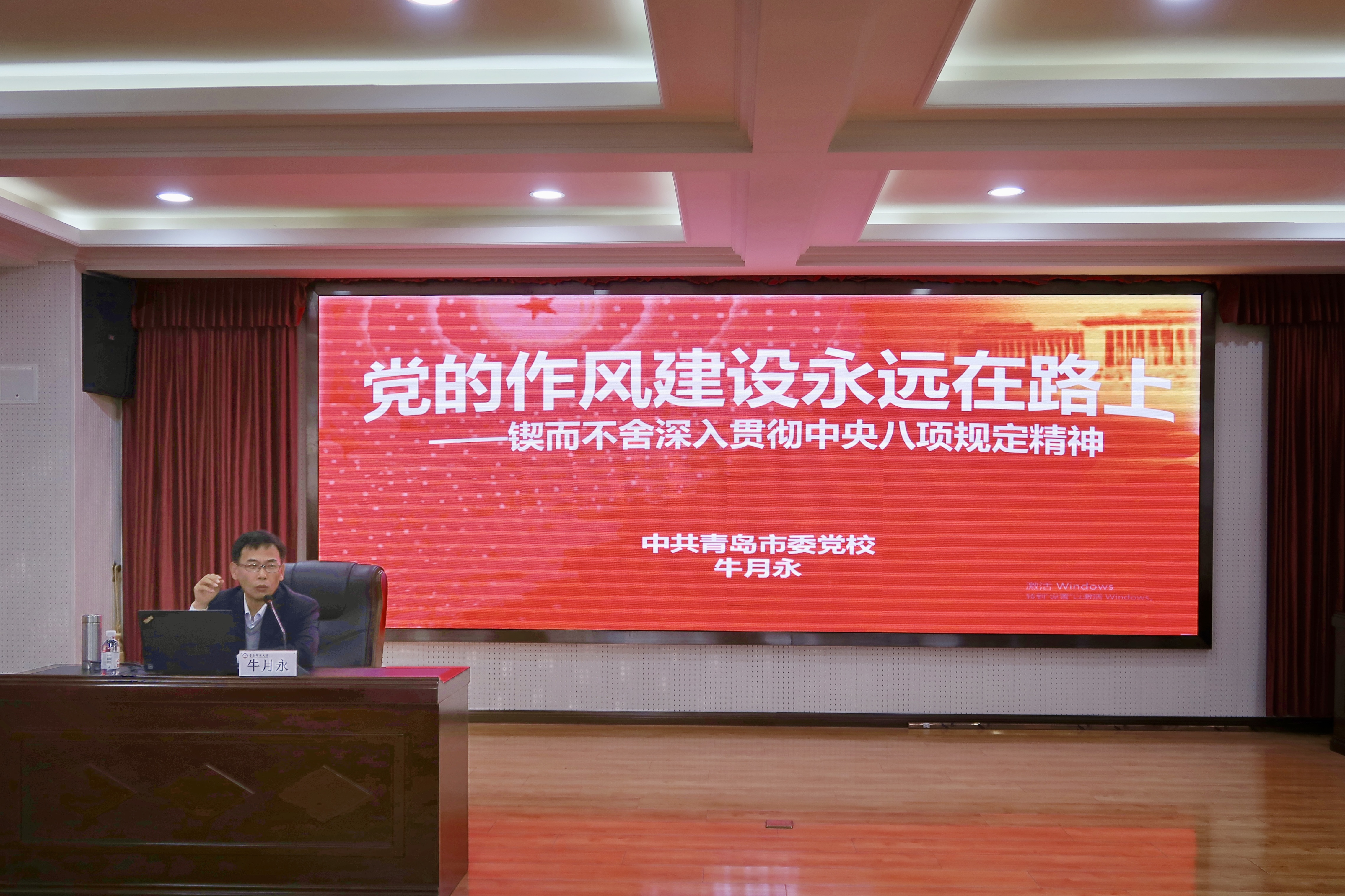 為深入學習貫徹中央八項規(guī)定精神,切實增強黨員干部遵規(guī)守紀意識,推動作風建設(shè)常態(tài)化、長效化,4月8日下午,青島科技大學馬克思主義學院特邀中共青島市委黨校校刊部主任牛月永教授于學院學術(shù)報告廳作《黨的作風建設(shè)永遠在路上——鍥而不舍深入貫徹中央八項規(guī)定精神》主題報告。報告會由馬克思主義學院黨總支書記李真主持,學院全體教職工和研究生黨員參加。