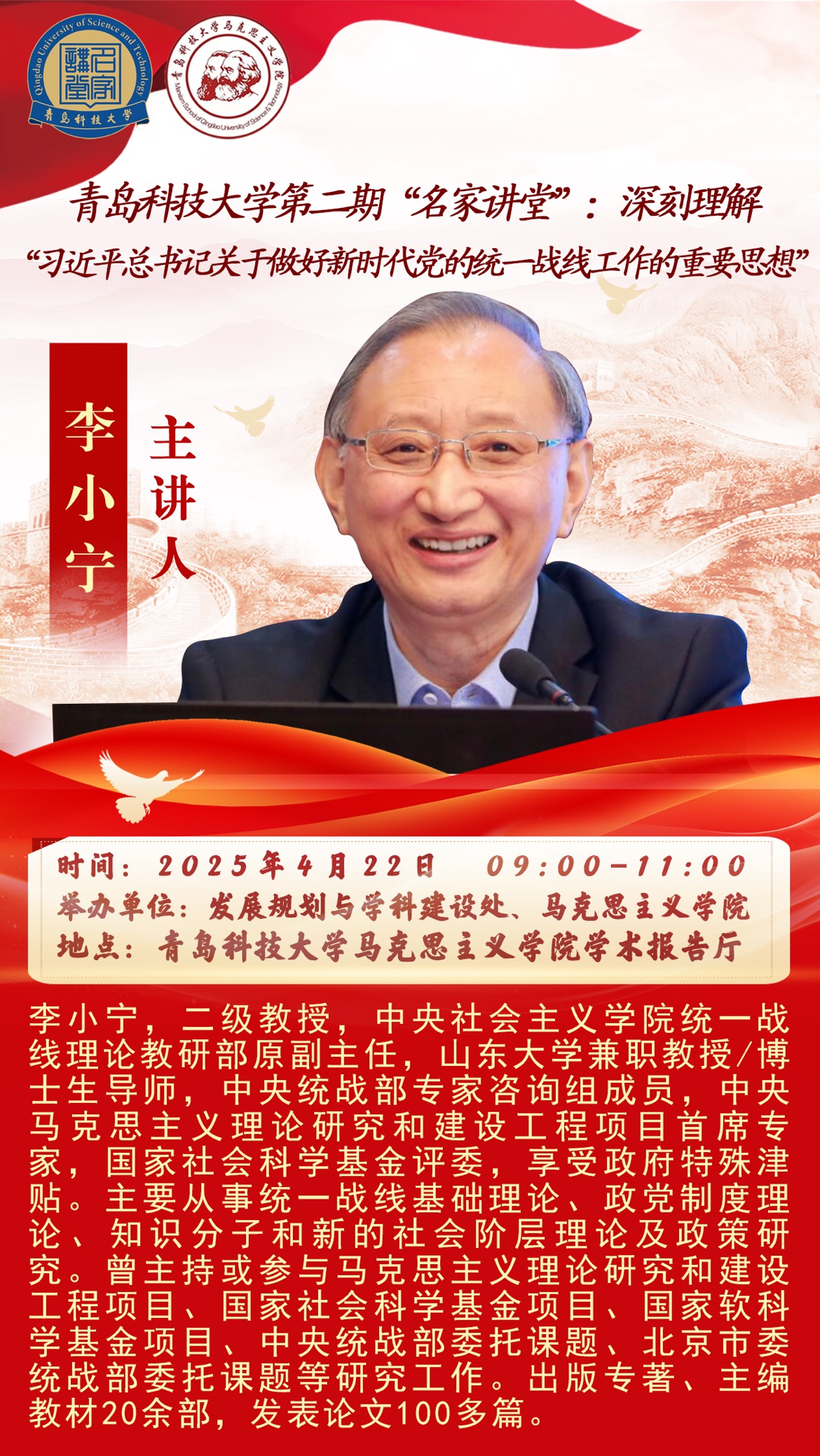 為深入學(xué)習(xí)貫徹習(xí)近平總書記關(guān)于做好新時(shí)代黨的統(tǒng)一戰(zhàn)線的重要思想,拓展師生學(xué)科視野,提升馬克思主義理論學(xué)科發(fā)展思路、找準(zhǔn)馬克思主義理論學(xué)科發(fā)展方向,提升馬克思主義理論統(tǒng)戰(zhàn)研究特色,提升馬克思主義理論學(xué)科聲譽(yù)和社會(huì)影響力,青島科技大學(xué)第二期“名家講堂”活動(dòng)將于4月22日上午9點(diǎn)舉行,中央馬工程首席專家、中央社會(huì)主義學(xué)院統(tǒng)一戰(zhàn)線理論教研部原副主任二級(jí)教授李小寧主題報(bào)告,請(qǐng)廣大師生積極參加。
