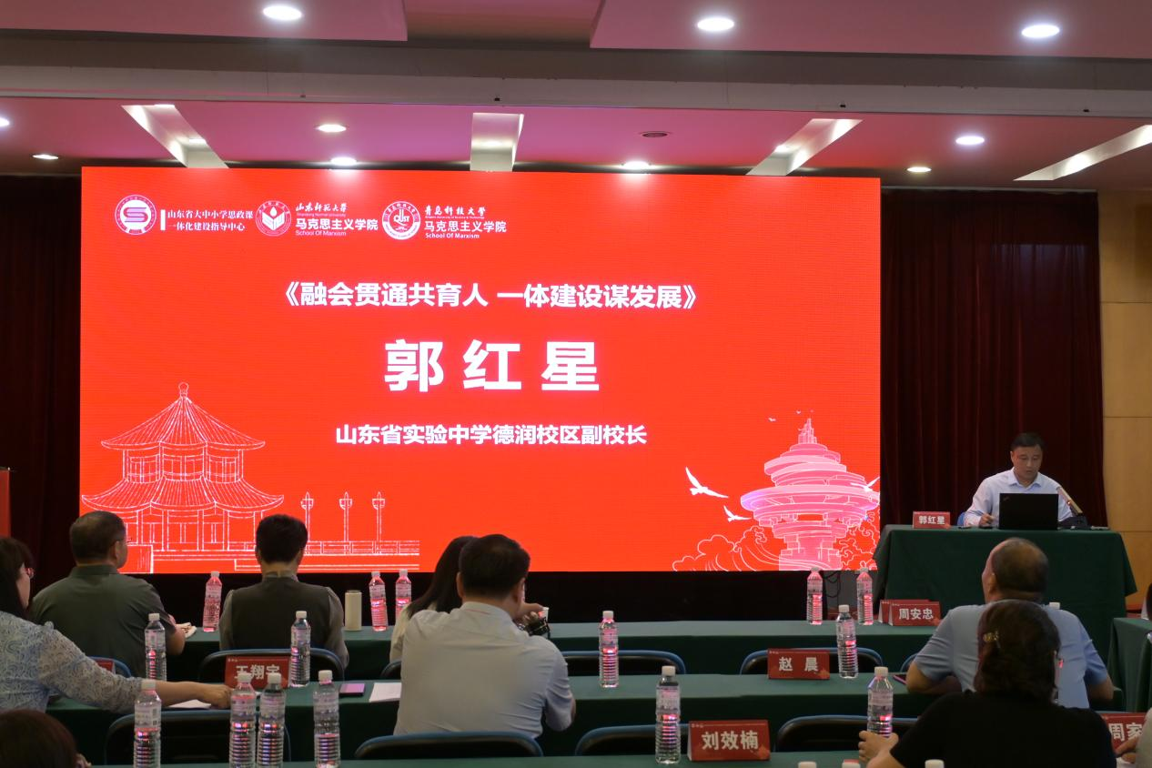 山東省實驗中學(xué)德潤校區(qū)副校長郭紅星以《融會貫通共育人一體建設(shè)謀發(fā)展》為題發(fā)言