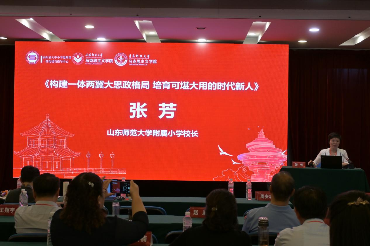 山東師范大學(xué)附屬小學(xué)校長張芳以《構(gòu)建一體兩翼大思政格局培育可堪大用的時代新人》為題發(fā)言