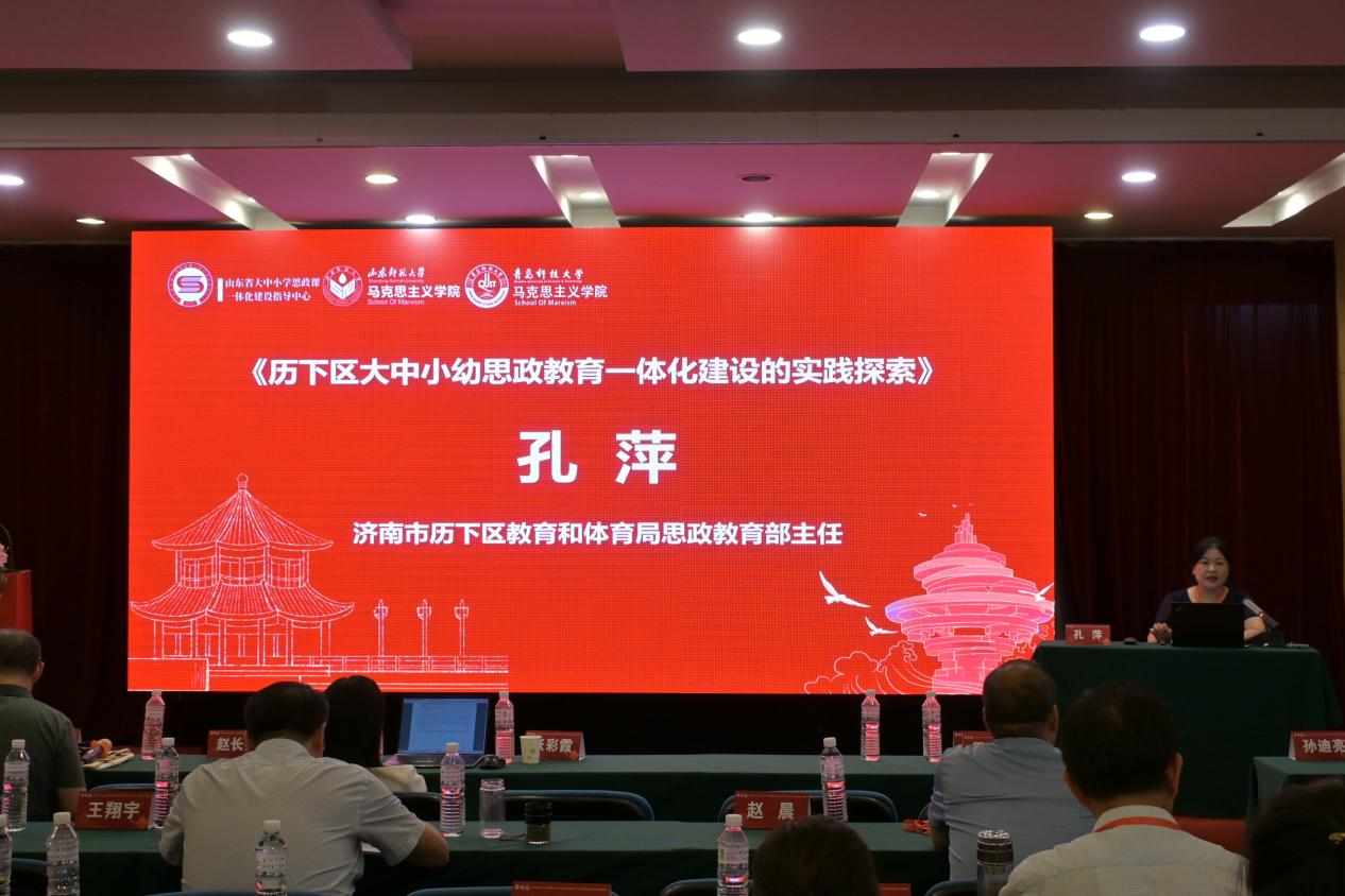 濟南市歷下區(qū)教育和體育局思政教育部主任孔萍以《歷下區(qū)大中小幼思政教育一體化建設(shè)的實踐探索》為題發(fā)言