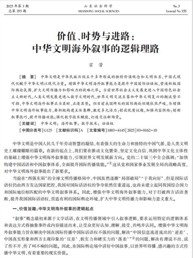 近日,我院宗芳老師撰寫的學(xué)術(shù)論文《價(jià)值、時(shí)勢(shì)與進(jìn)路:中華文明海外敘事的邏輯理路》在CSSCI來源期刊《山東社會(huì)科學(xué)》2025年第3期發(fā)表。《山東社會(huì)科學(xué)》是由山東省社會(huì)科學(xué)界聯(lián)合會(huì)主管主辦、《山東社會(huì)科學(xué)》雜志社編輯出版的綜合性哲學(xué)社會(huì)科學(xué)類學(xué)術(shù)期刊,創(chuàng)刊于1987年。該期刊被認(rèn)定為CSSCI來源期刊、全國(guó)中文核心期刊、中國(guó)人文社會(huì)科學(xué)核心期刊等。