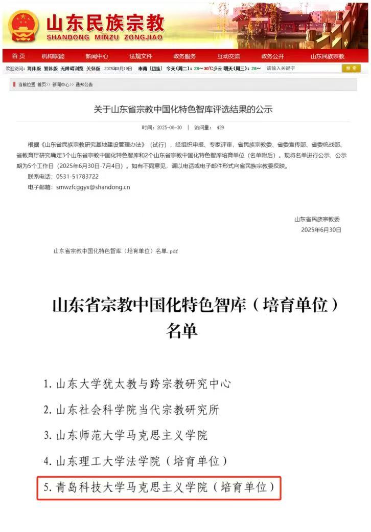 近日,山東省民族宗教委會同省委宣傳部、省委統(tǒng)戰(zhàn)部、省教育廳組織開展了山東省宗教中國化特色智庫申報和評審工作。經(jīng)專家評審,研究確定了3家山東省宗教中國化特色智庫和2家山東省宗教中國化特色智庫培育單位。青島科技大學(xué)馬克思主義學(xué)院成功入選山東省宗教中國化特色智庫培育單位。