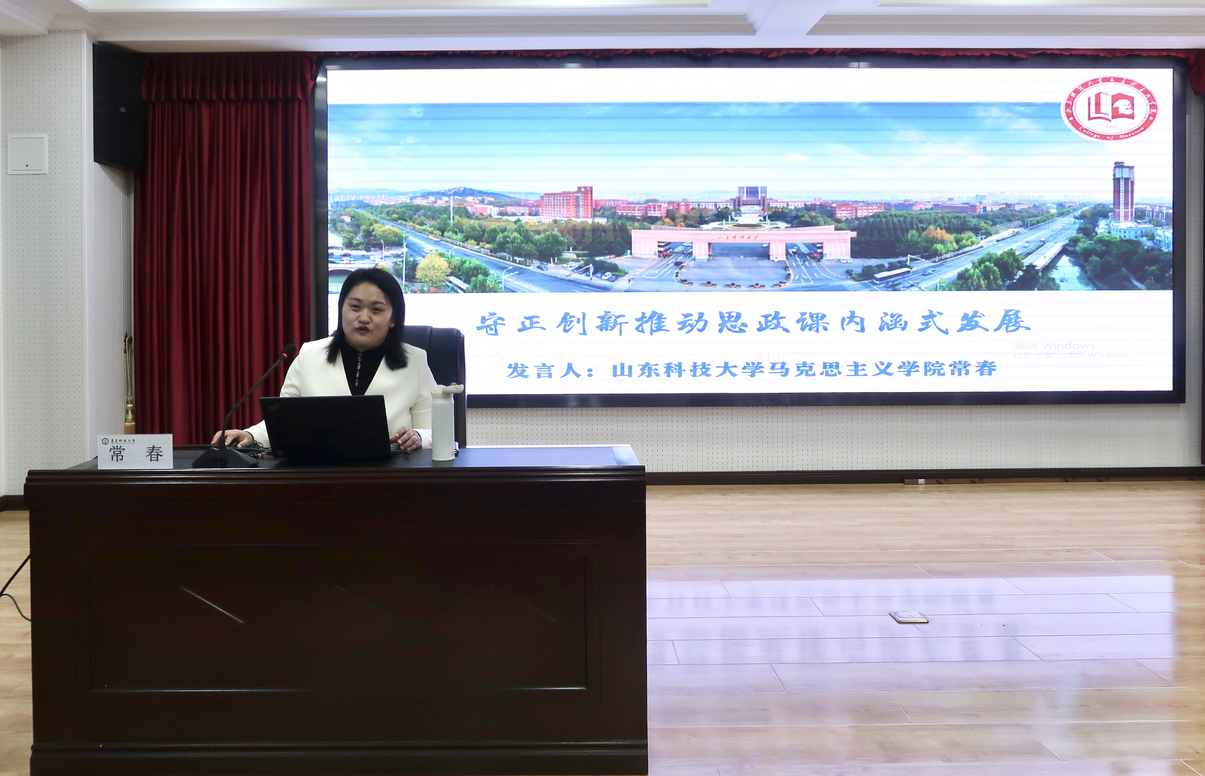 論壇主旨報(bào)告階段,由馬克思主義學(xué)院副院長郭江龍主持。山東科技大學(xué)馬克思主義學(xué)院副院長、山東省普通高等學(xué)校教學(xué)名師、山東省教學(xué)成果一等獎(jiǎng)獲得者、山東省學(xué)校思政課“思想道德與法治”分教指委委員常春教授以《守正創(chuàng)新推動思政課內(nèi)涵式發(fā)展》為題作專題報(bào)告,思政課教師要以中國特色社會主義取得的舉世矚目成就為內(nèi)容支撐,以中華優(yōu)秀傳統(tǒng)文化、革命文化和社會主義先進(jìn)文化為力量根基,用鮮活的素材、靈活的方式增強(qiáng)思政課的思想性、理論性和親和力、針對性,堅(jiān)持在守正創(chuàng)新中推動思政課建設(shè)高質(zhì)量發(fā)展。