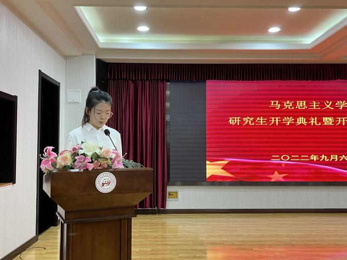 2022級新生代表于洋在發(fā)言中對全體老師的密切關(guān)注和學長學姐們的無私幫助表示了感謝,她倡議全體同學一起懷揣對學術(shù)的向往,確立目標,努力學習。