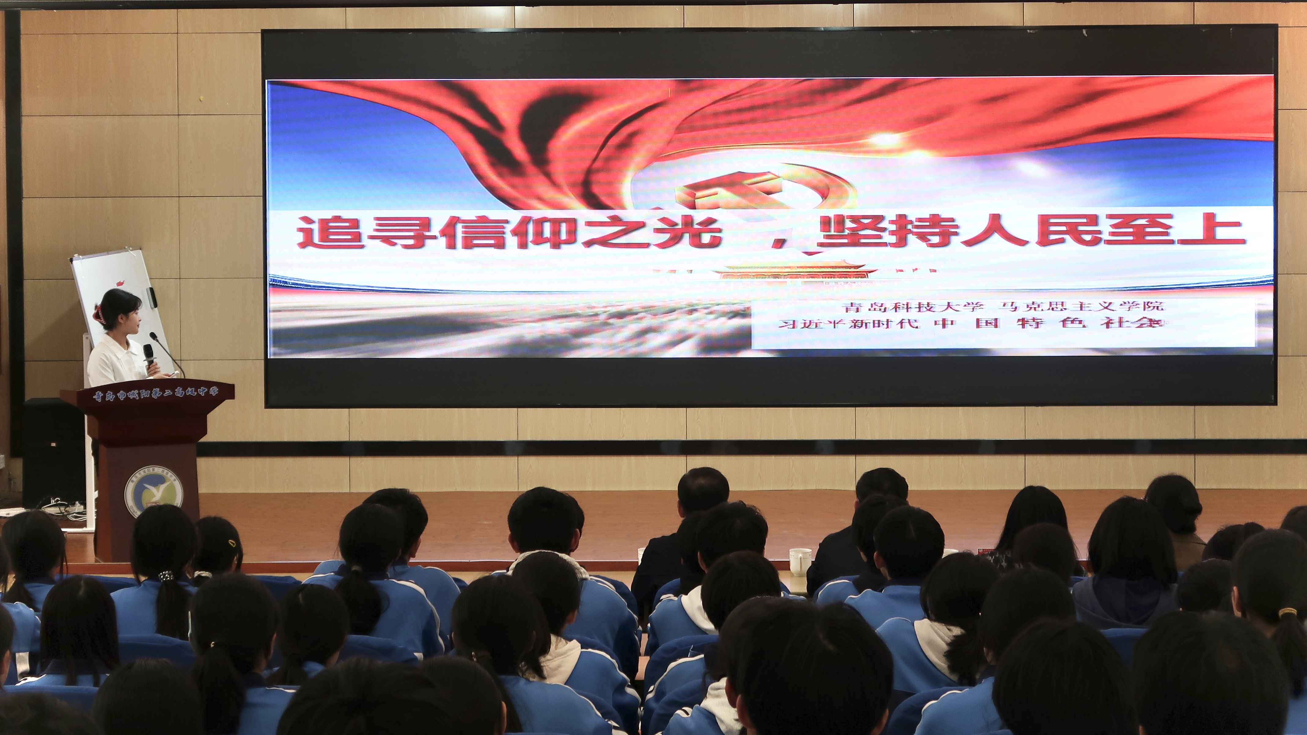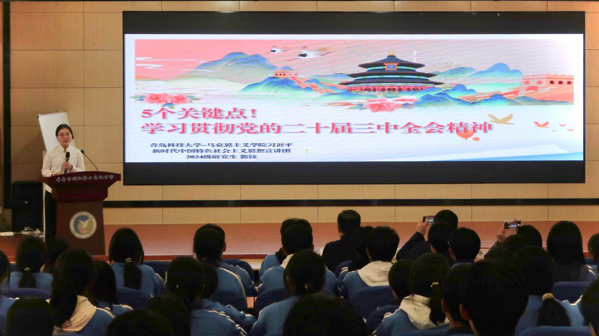 為深入學習貫徹黨的二十屆三中全會精神,引導青年堅定理想信念、緊跟黨走,在黨的領導與感召下勇?lián)鷼v史責任,10月26日下午,馬克思主義學院習近平新時代中國特色社會主義思想宣講團赴青島市城陽第二高級中學開展“深悟立法內(nèi)涵 厚植愛國主義”主題宣講活動。城陽第二高級中學副校長肖吉萃、校團委書記毛文靜,青島科技大學馬克思主義學院副院長郭江龍、馬克思主義中國化教研室副主任欒超出席本次活動,城陽第二高級中學團干部代表和入團積極分子參與本次活動。