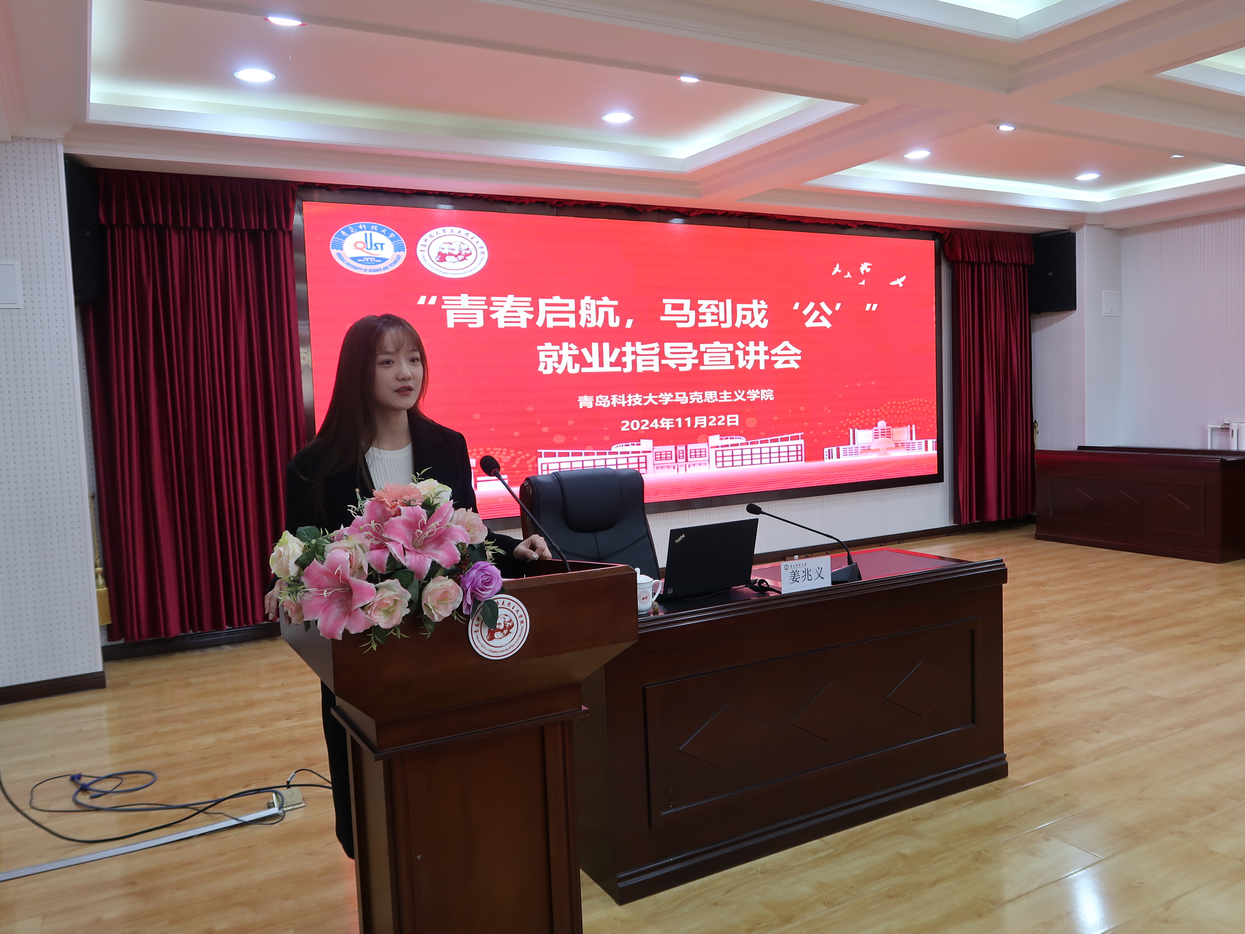 為引導(dǎo)青年學(xué)生樹(shù)立正確的擇業(yè)觀、就業(yè)觀和職業(yè)觀,進(jìn)一步把握就業(yè)方向、找準(zhǔn)職業(yè)定位、提升就業(yè)能力,助力馬克思主義學(xué)院學(xué)生實(shí)現(xiàn)高質(zhì)量就業(yè),11月22日下午,馬克思主義學(xué)院于學(xué)術(shù)報(bào)告廳成功舉辦“青春?jiǎn)⒑?馬到成‘公’”就業(yè)指導(dǎo)講座。本次講座邀請(qǐng)?jiān)鄭u市政協(xié)專職常委姜兆義擔(dān)任講師,青島科技大學(xué)人文社科處副處長(zhǎng)汪洋、馬克思主義學(xué)院黨總支書(shū)記李真出席本次講座,馬克思主義學(xué)院2022級(jí)、2023級(jí)全體研究生參加講座,講座由馬克思主義學(xué)院團(tuán)總支書(shū)記李文睿主持。