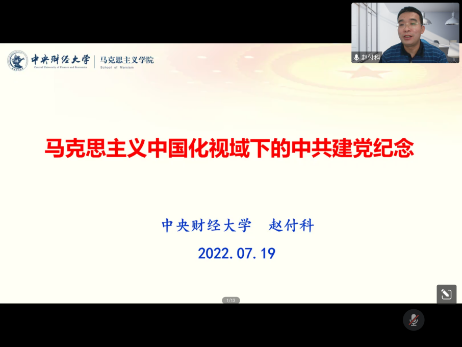 為深入學(xué)習(xí)中共建黨紀(jì)念對科學(xué)馬克思主義的回答、對中國化馬克思主義的闡釋以及對馬克思主義中國化歷史進(jìn)程的推動作用,7月19日晚,青島科技大學(xué)馬克思主義學(xué)院邀請中央財(cái)經(jīng)大學(xué)馬克思主義學(xué)院教授、博士生導(dǎo)師,《高校馬克思主義理論教育研究》雜志副主編,中央馬克思主義理論研究和建設(shè)工程重點(diǎn)教材《中國近現(xiàn)代史綱要》(2021年版)課題組主要成員,團(tuán)中央“青馬工程”理論導(dǎo)師趙付科教授以“馬克思主義中國化視域下的中共建黨紀(jì)念”為題作專題報(bào)告。馬克思主義學(xué)院黨總支書記張鳴、院長曹勝、副院長曲慧敏及全體師生參加本次線上活動。本次活動是馬克思主義學(xué)院黨總支理論學(xué)習(xí)中心組、教職工政治學(xué)習(xí)、馬克思主義學(xué)術(shù)論壇系列活動之一。